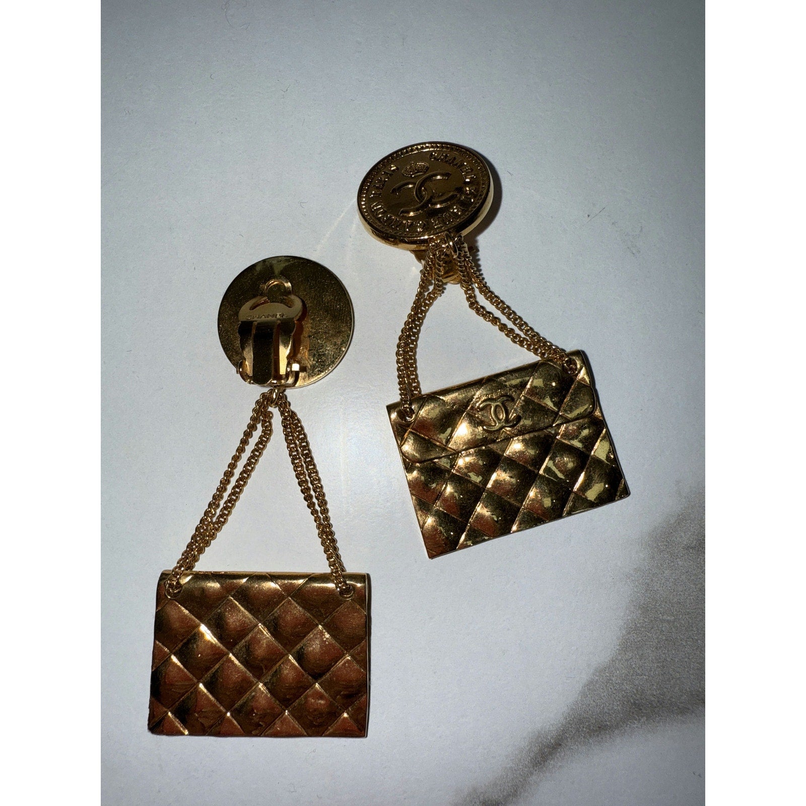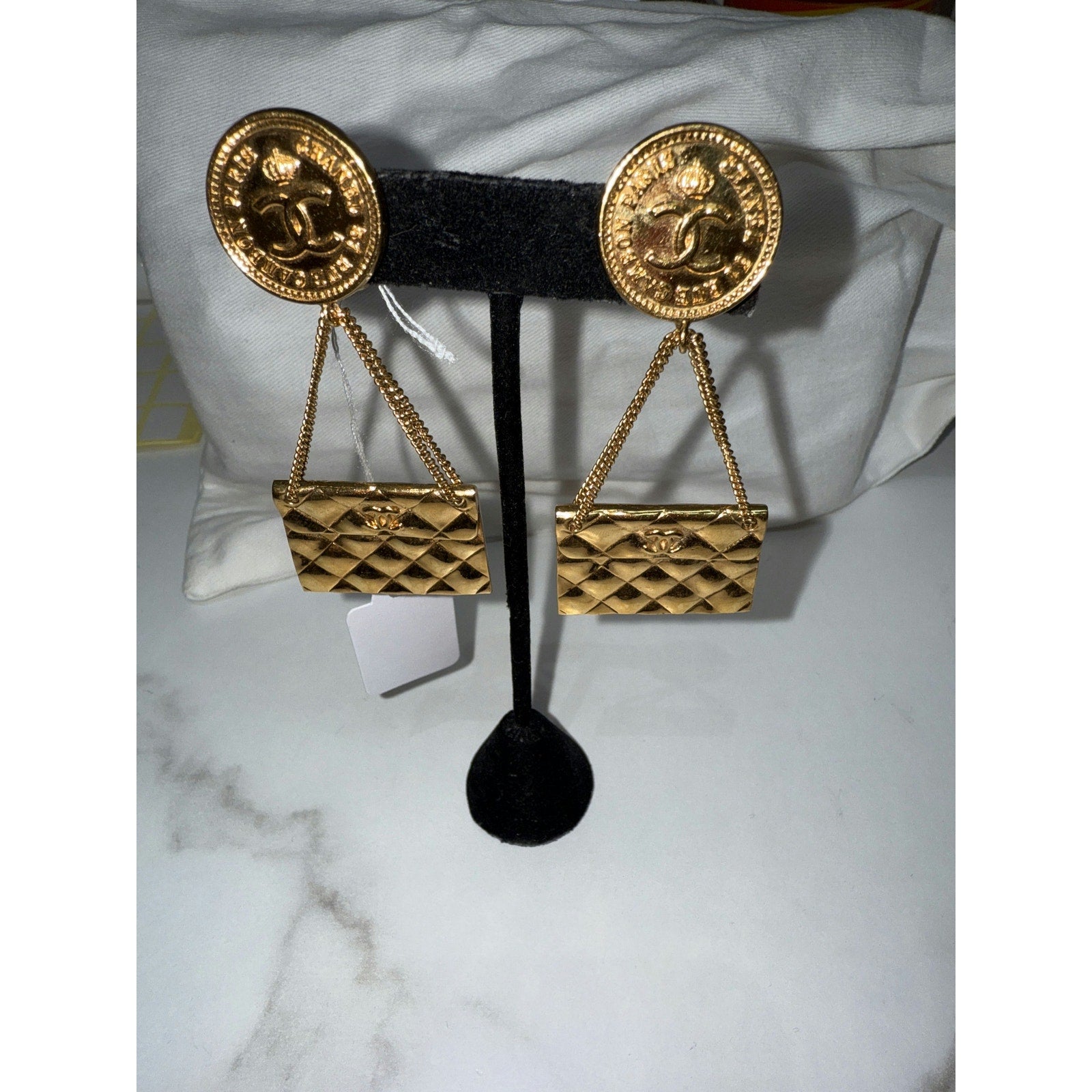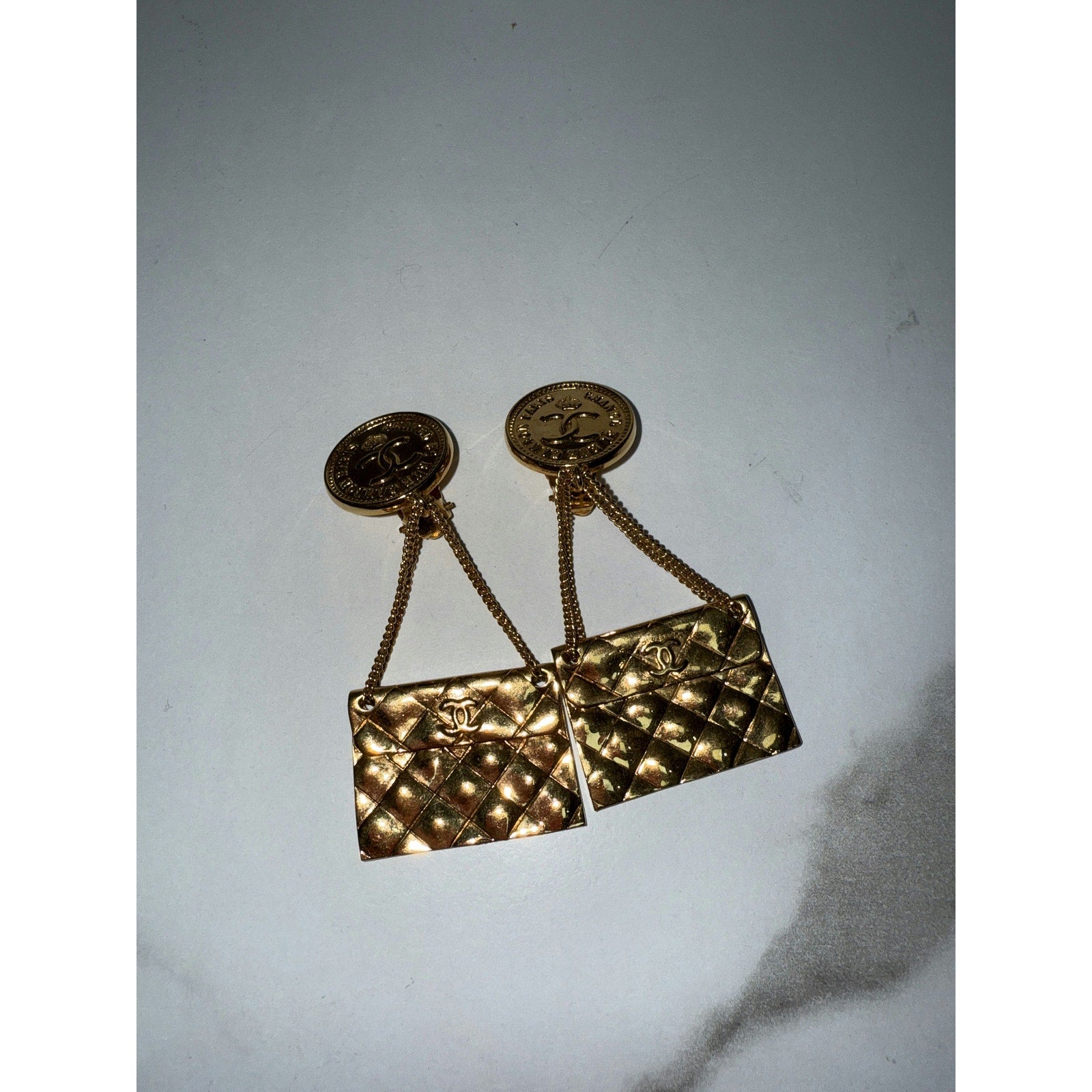 These luxurious Chanel dangle earrings are a stunning accessory, featuring a chic quilted handbag design. The gold-tone metal and iconic CC logo add elegance and sophistication, making them perfect for any occasion.