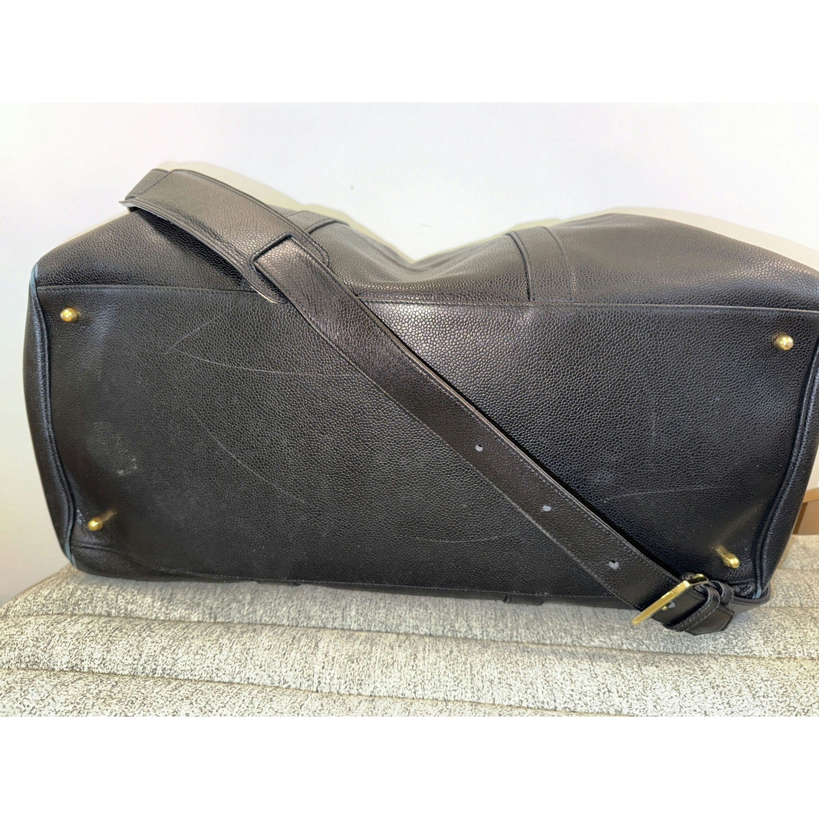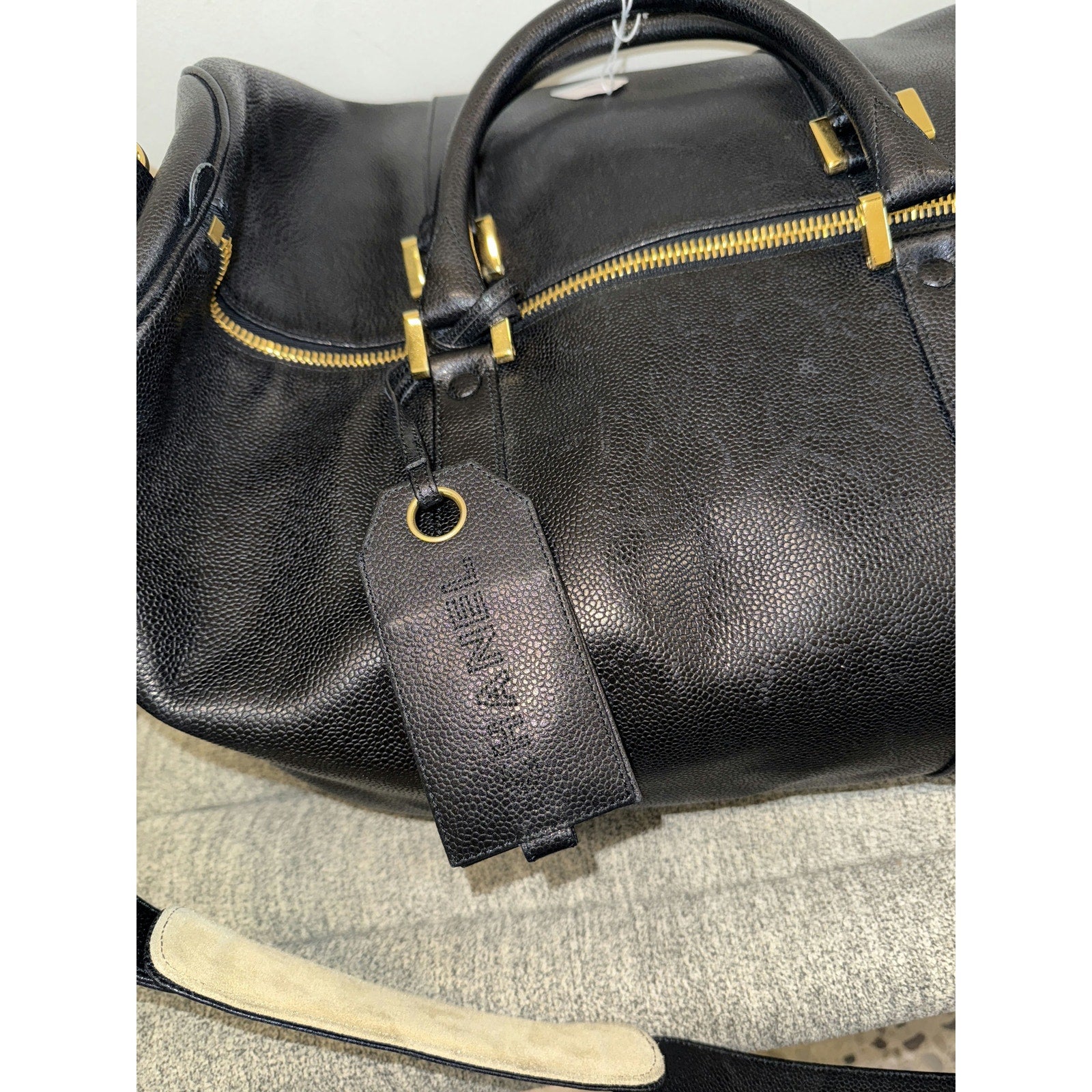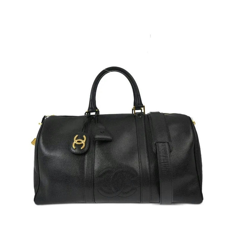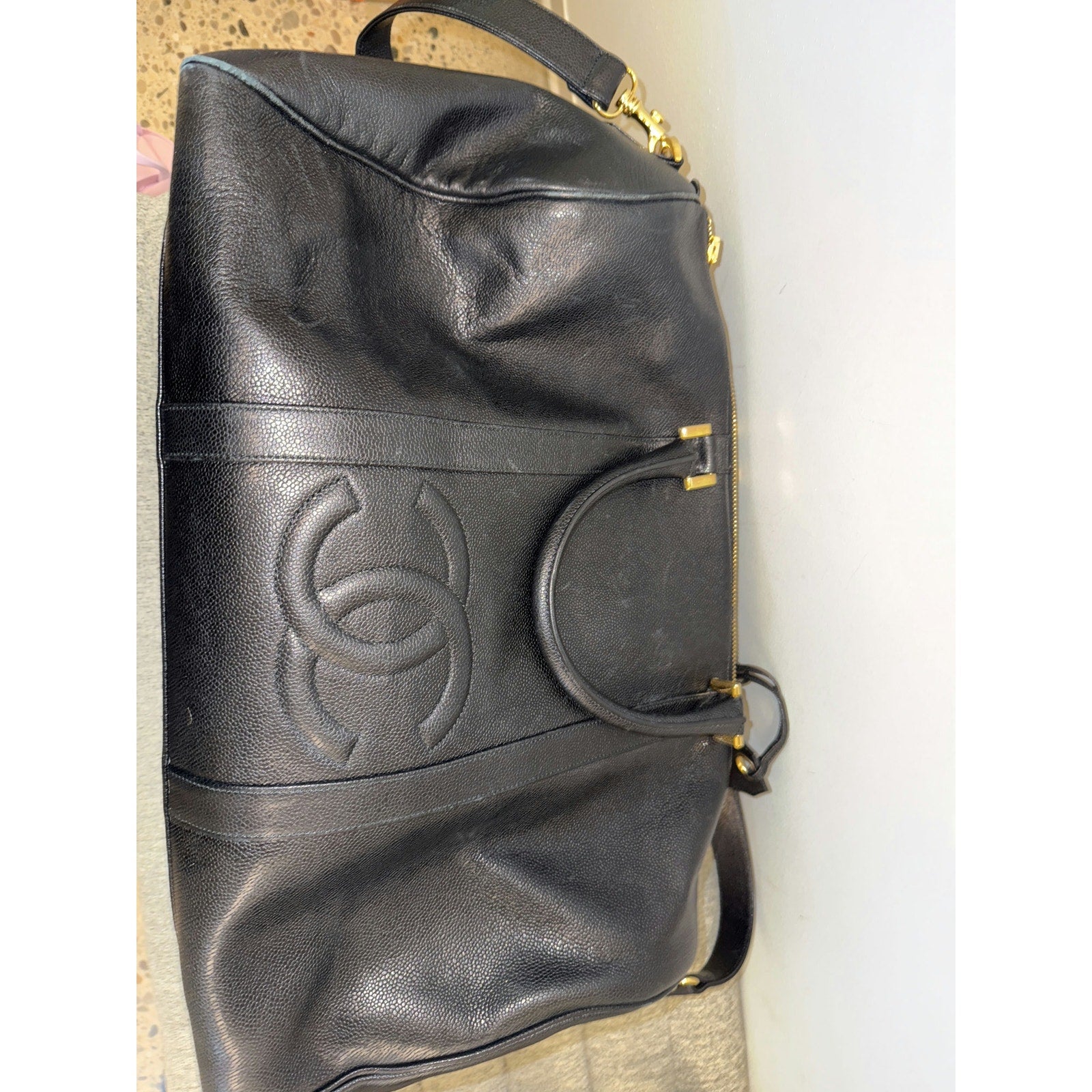 This luxurious Chanel duffel bag is crafted from high-quality black leather, featuring the iconic Chanel logo and gold-tone hardware. Ideal for travel or daily use, offering ample space and timeless elegance.