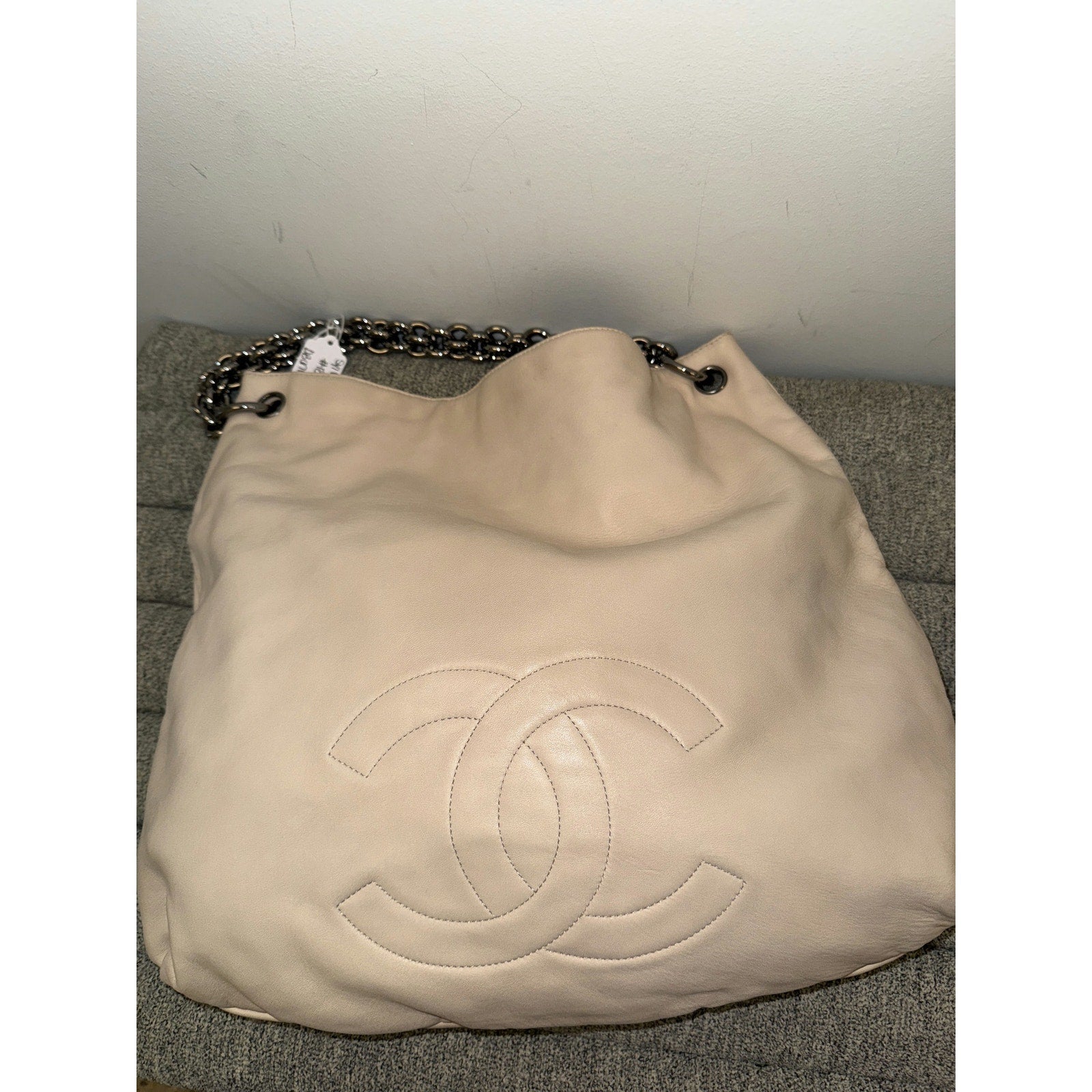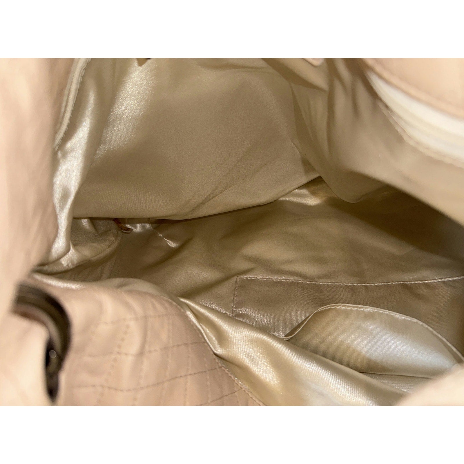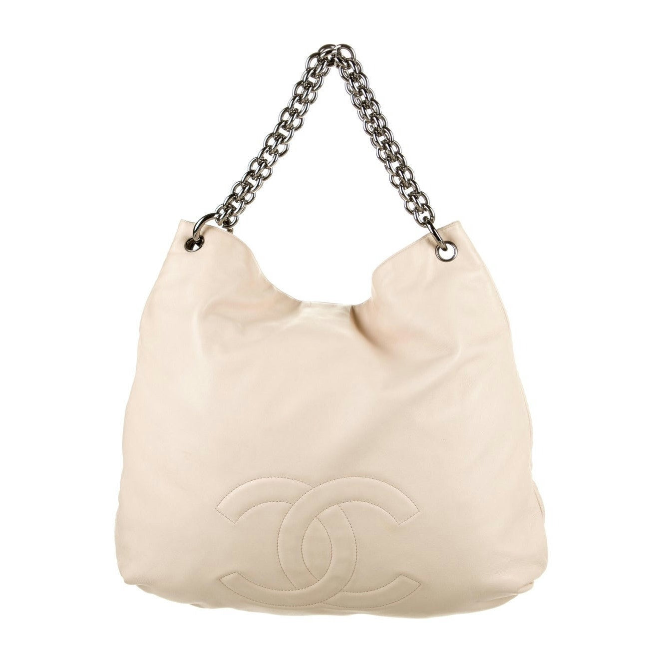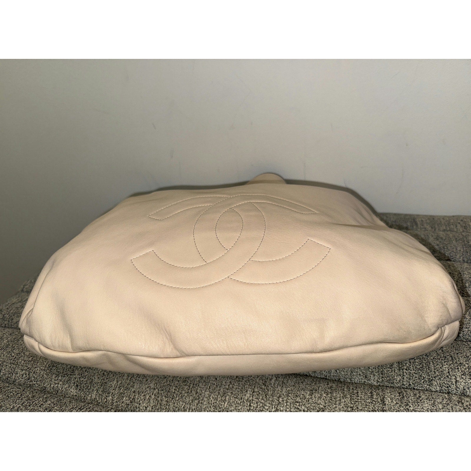 This elegant Chanel hobo bag features a soft beige leather exterior with the classic Chanel logo and a stylish chain strap. Perfect for adding a touch of sophistication to any outfit, it offers both luxury and practicality.