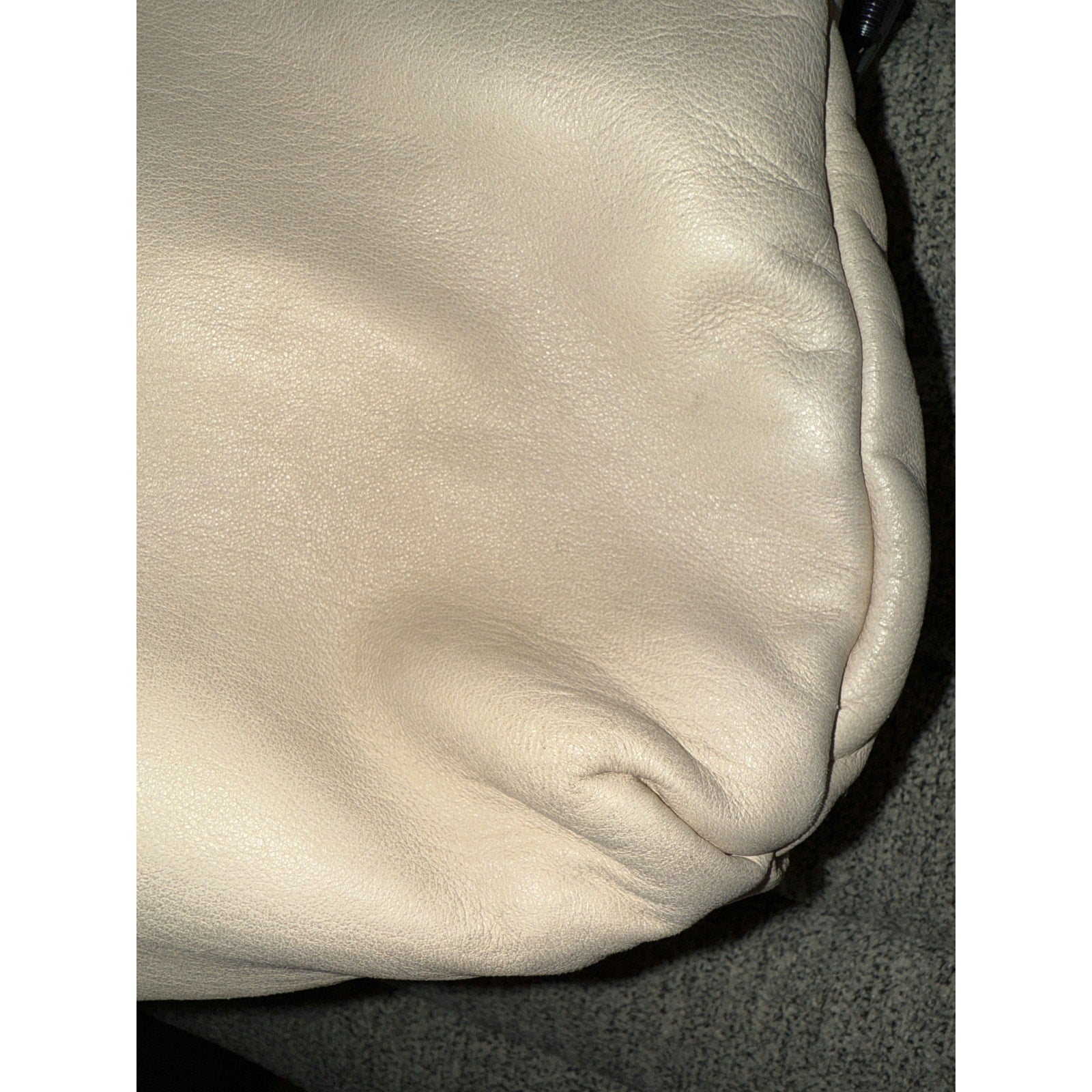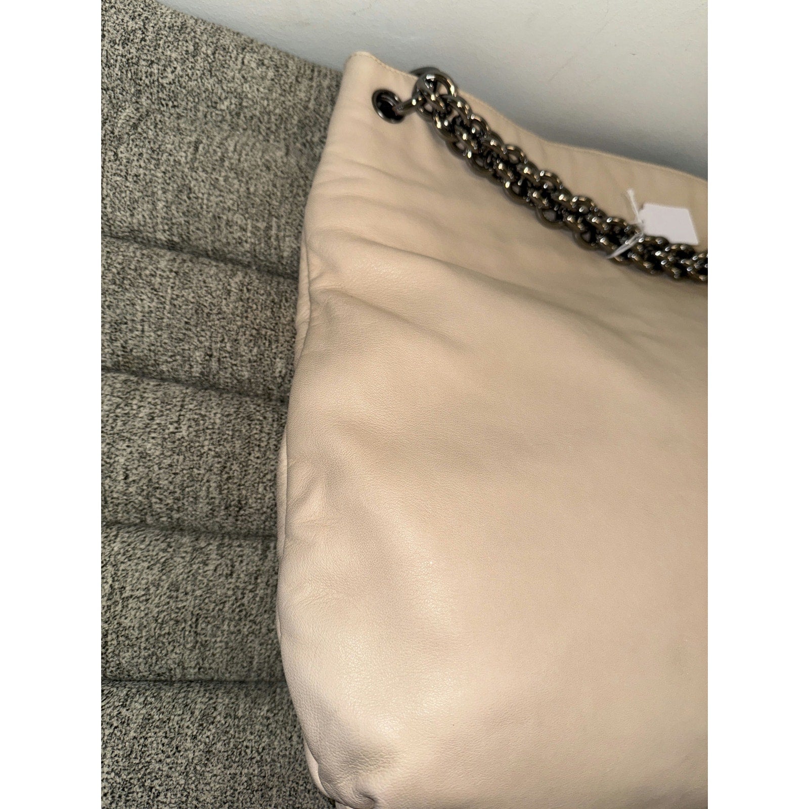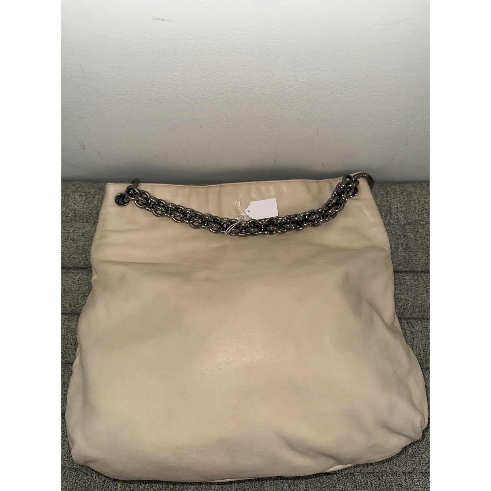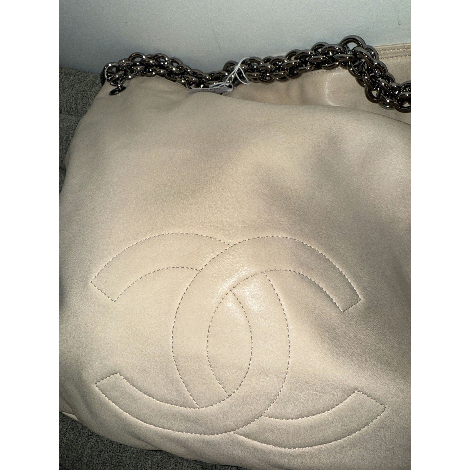 This elegant Chanel hobo bag features a soft beige leather exterior with the classic Chanel logo and a stylish chain strap. Perfect for adding a touch of sophistication to any outfit, it offers both luxury and practicality.