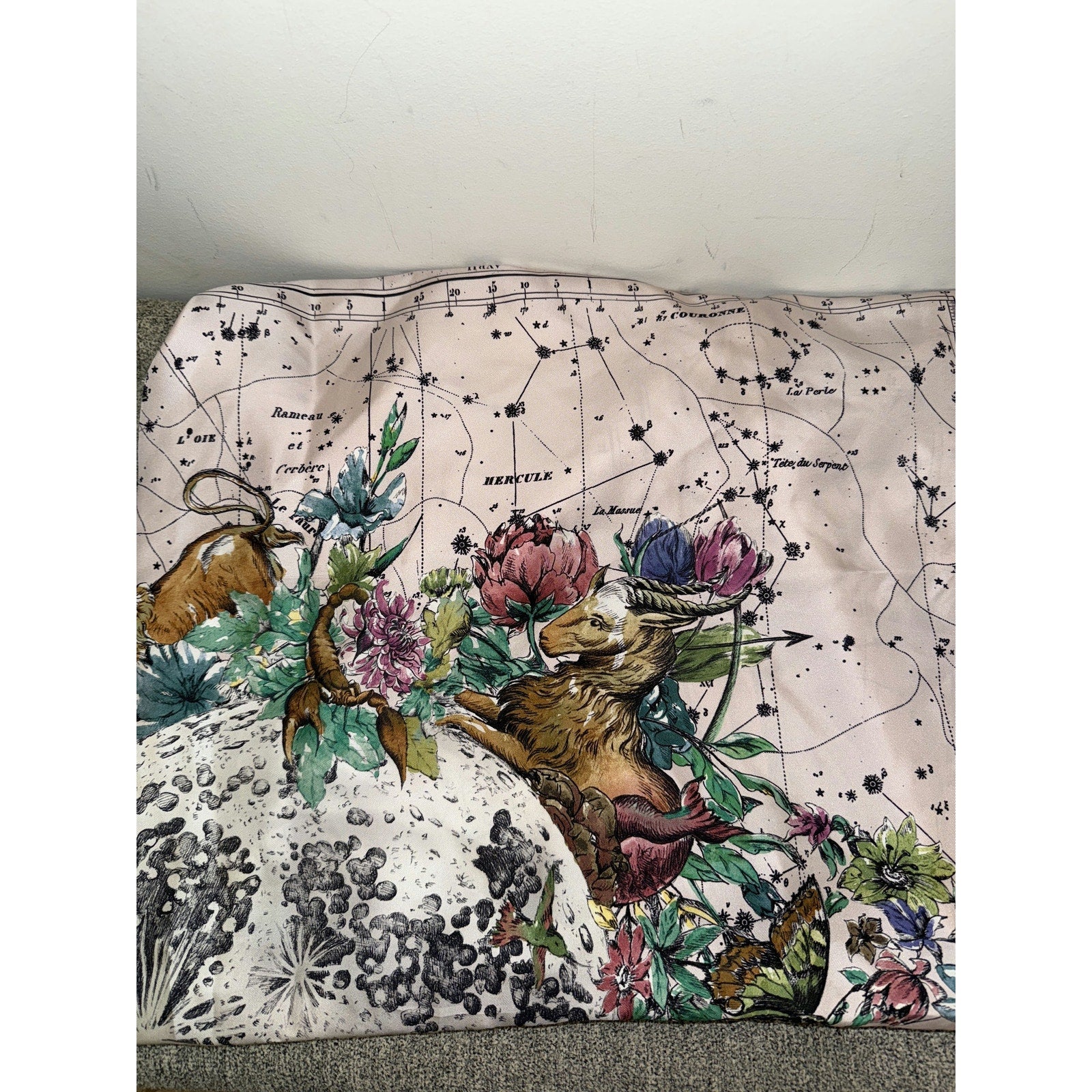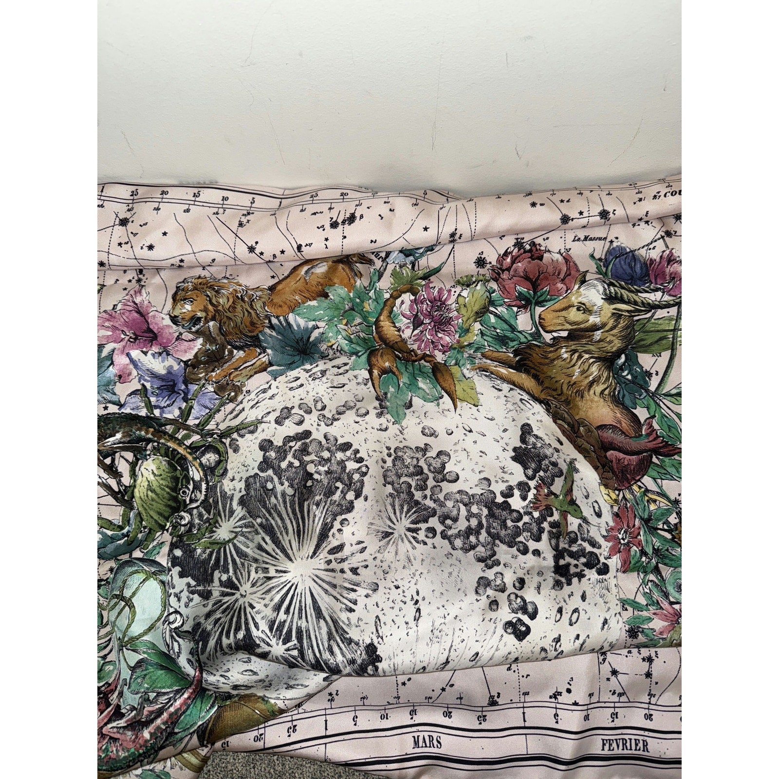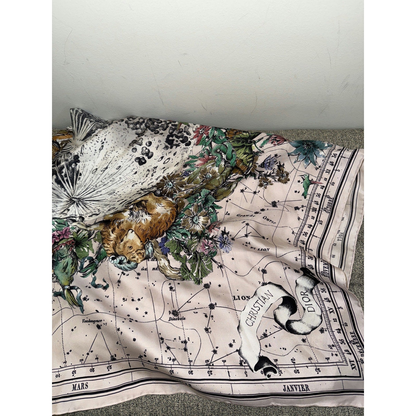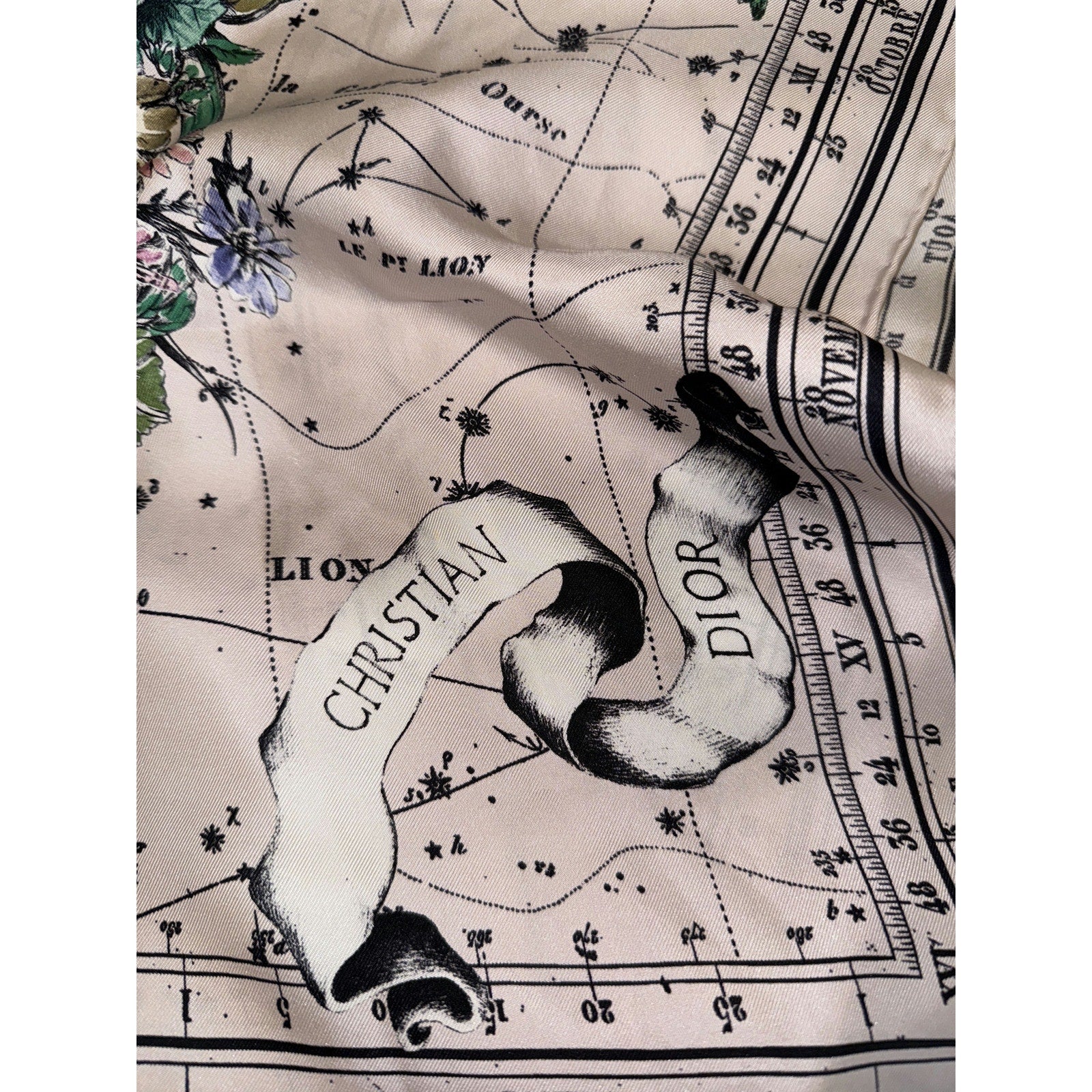 This exquisite Christian Dior silk scarf features a beautiful celestial and floral design, showcasing intricate detailing and vibrant colors. Perfect for adding a touch of elegance and sophistication to any outfit.