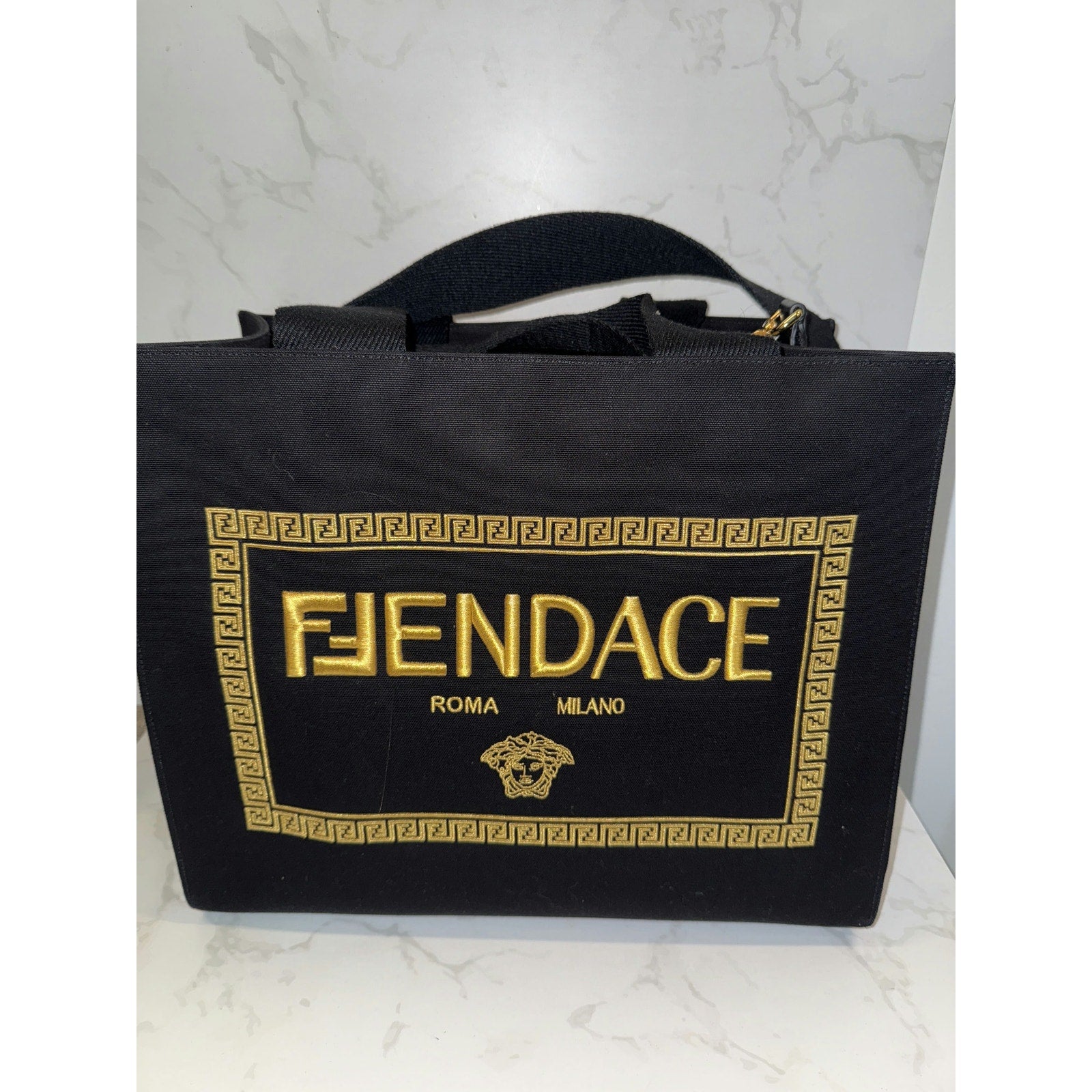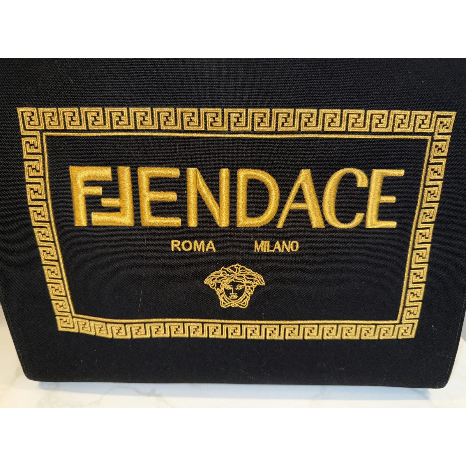 This exclusive Fendi x Versace collaboration tote showcases the striking "Fendace" logo, blending the luxury aesthetics of both brands. Crafted in sleek black with gold accents, this tote is a statement piece perfect for fashion enthusiasts.