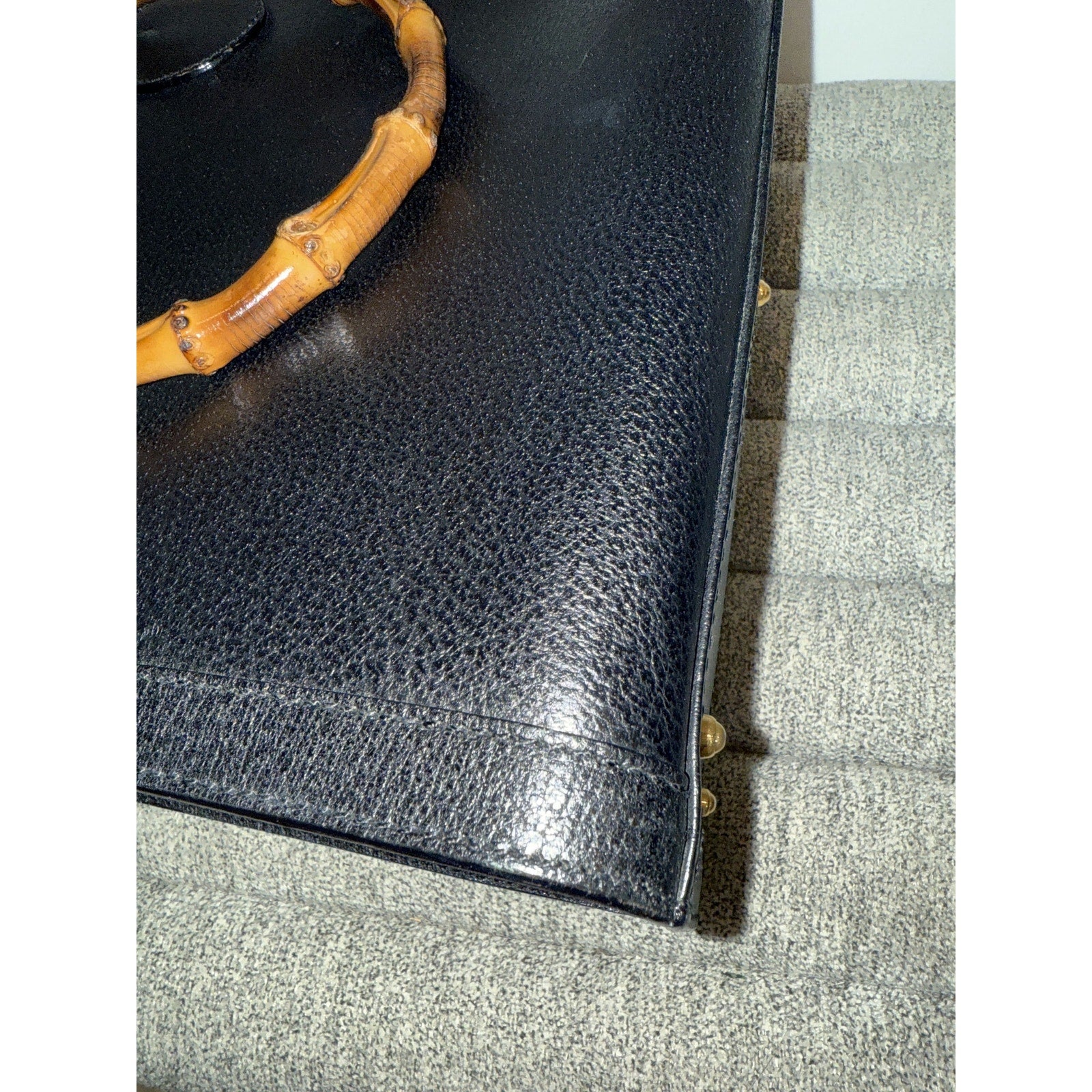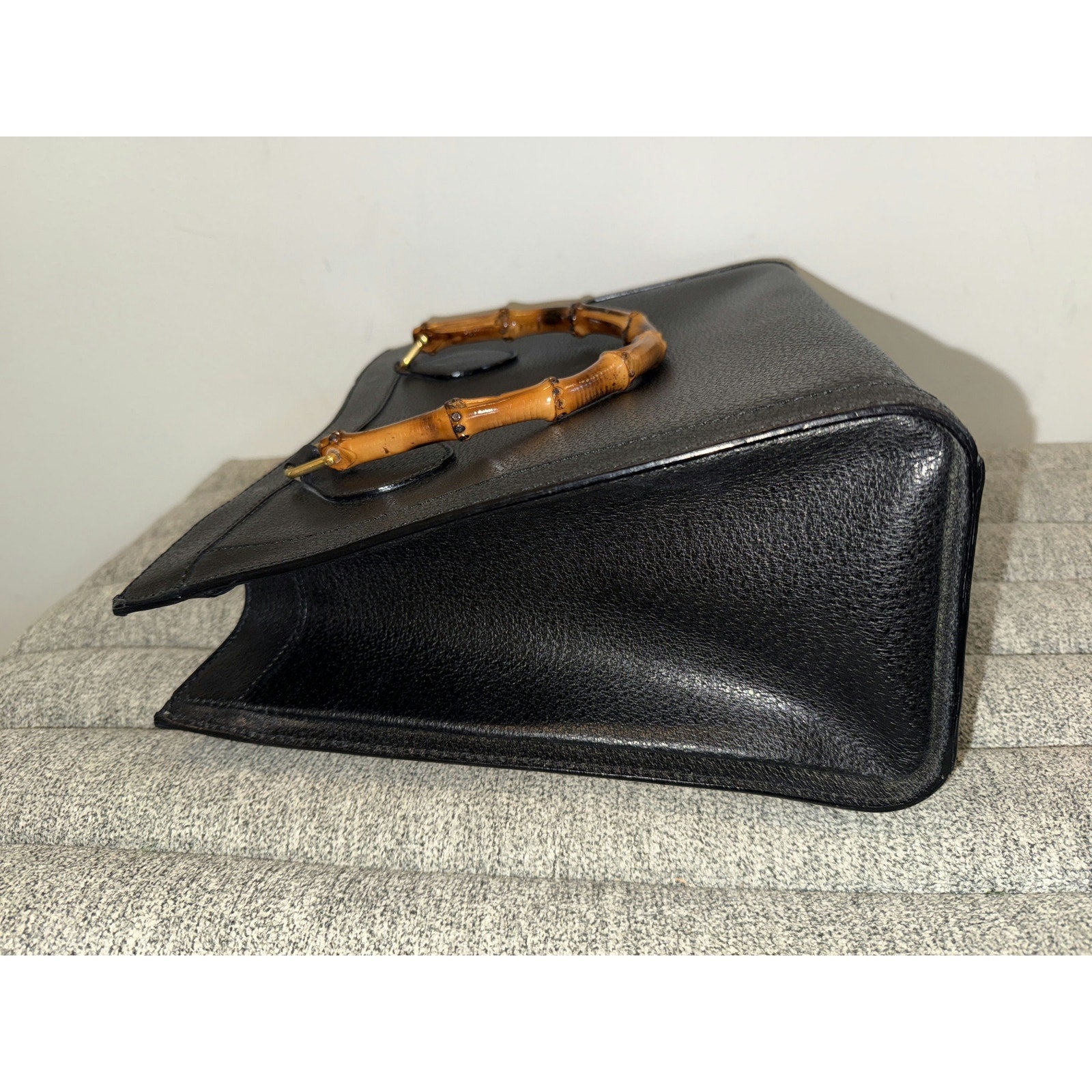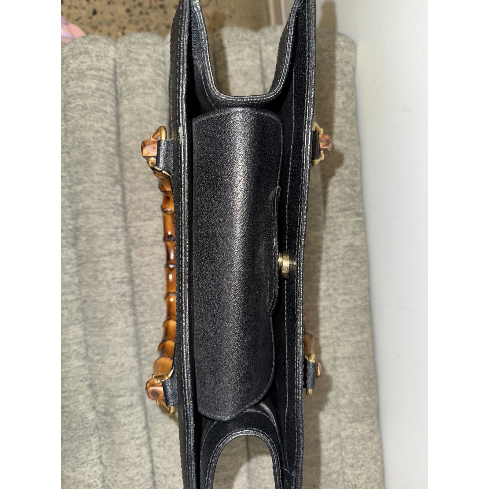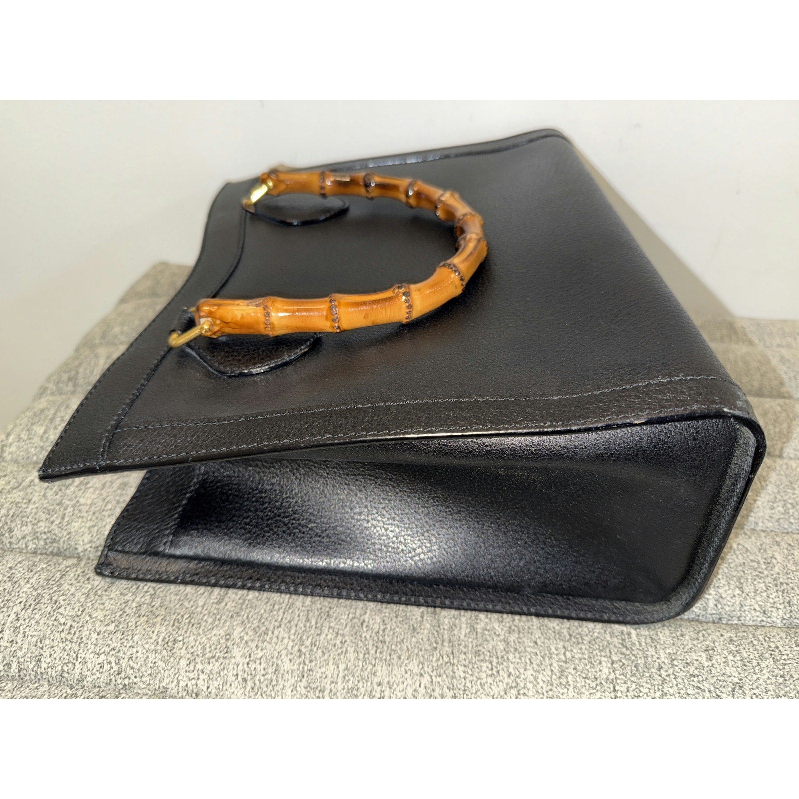 This vintage Gucci bag features the iconic bamboo top handles, adding a unique and timeless touch to its elegant black leather design. Perfect for those who appreciate classic fashion with a distinctive flair.