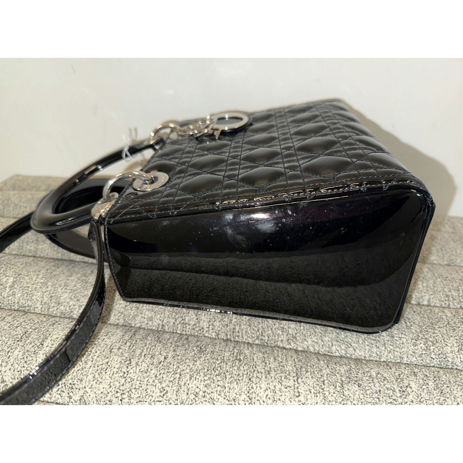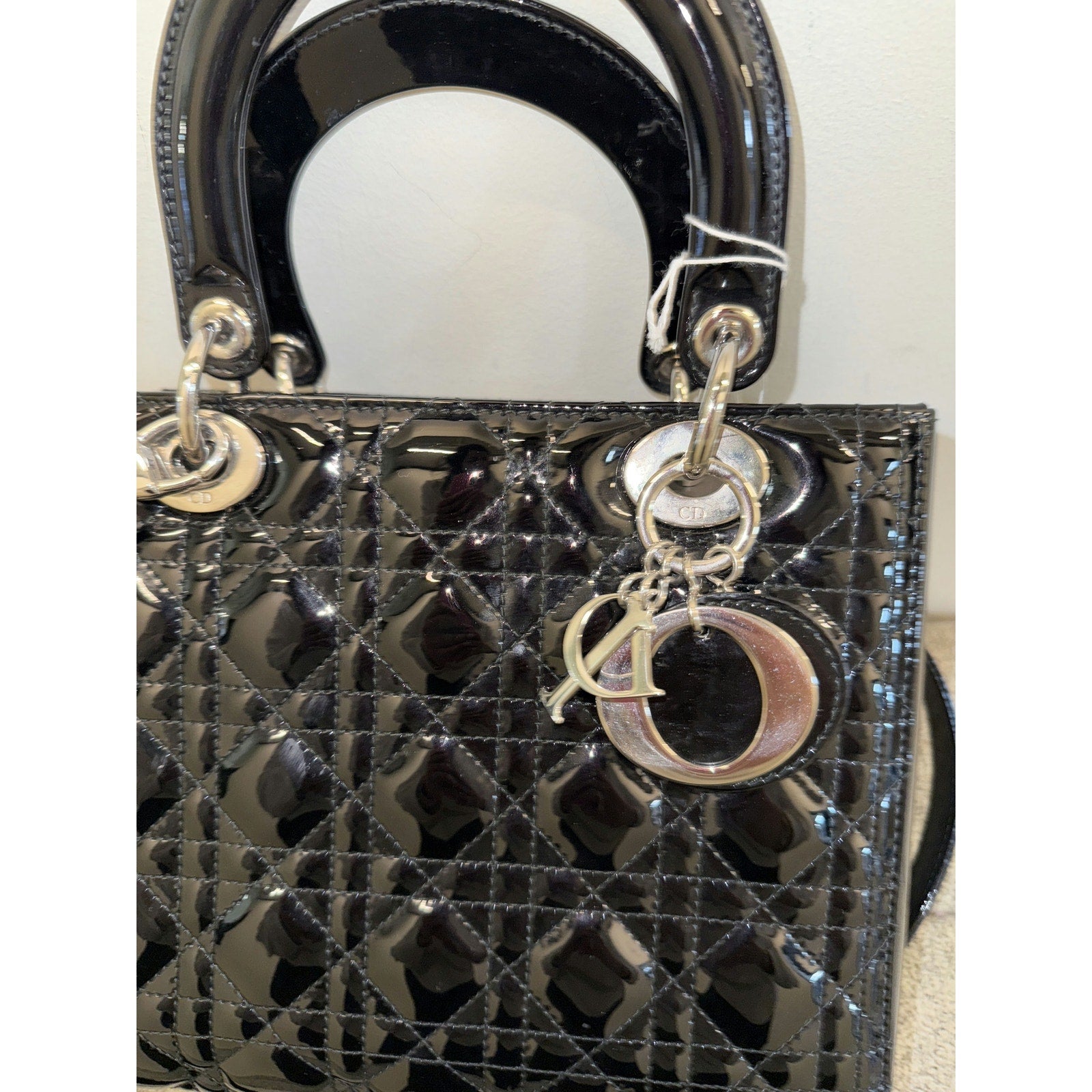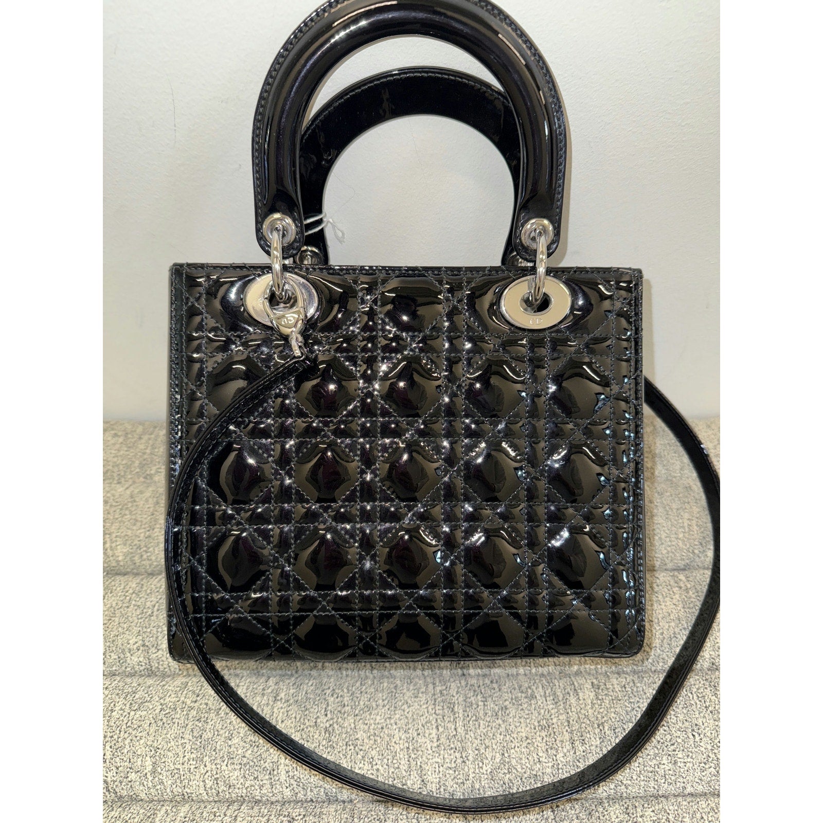 This elegant Lady Dior bag features the iconic quilted pattern and shiny patent leather, complete with silver-tone hardware. Its timeless design and sophisticated style make it a versatile accessory for any occasion.