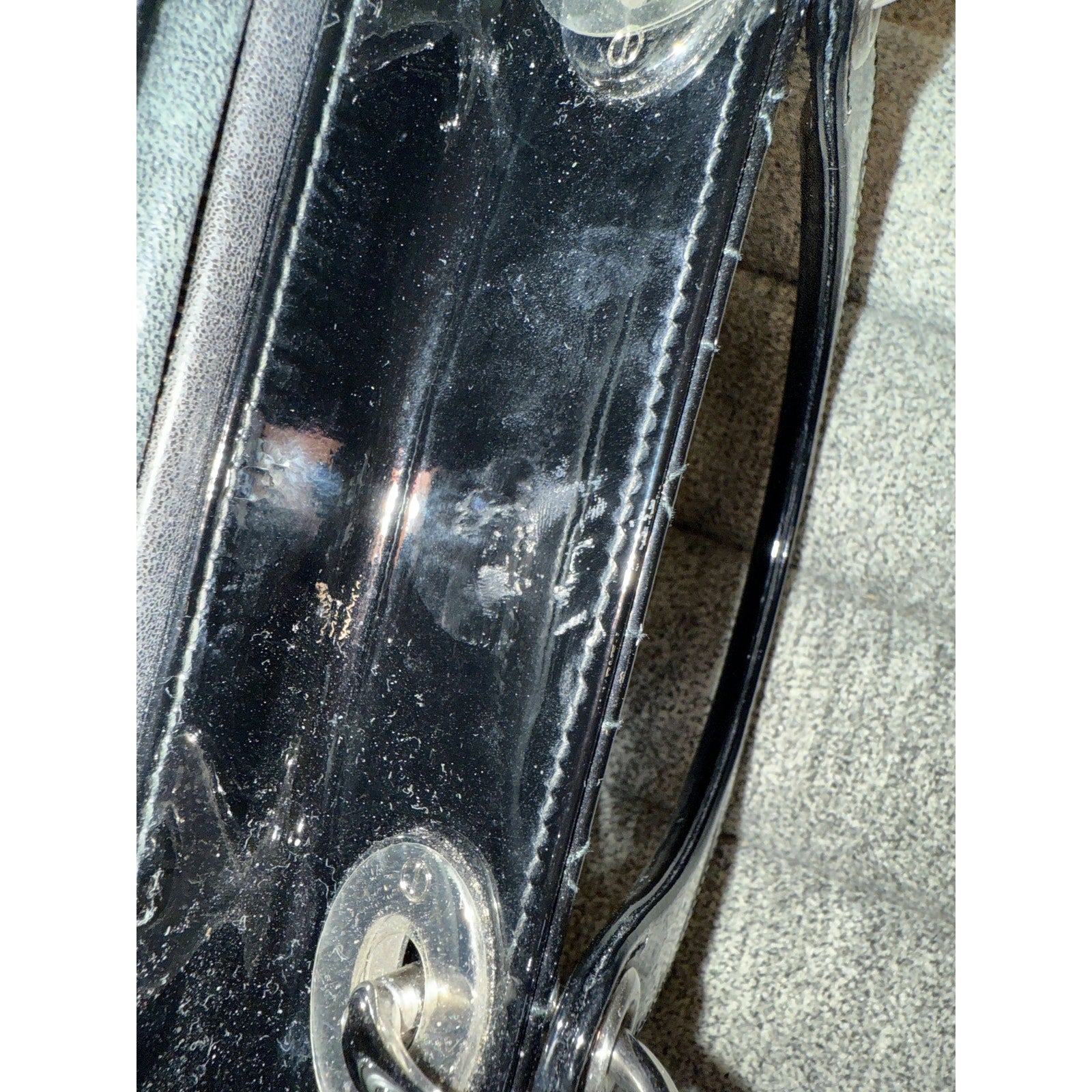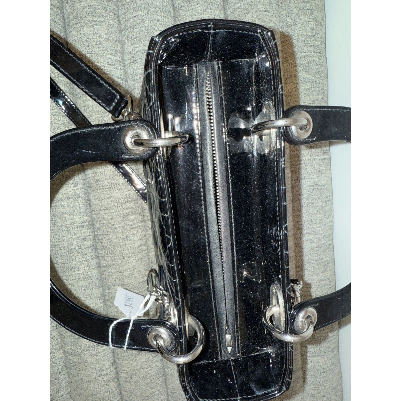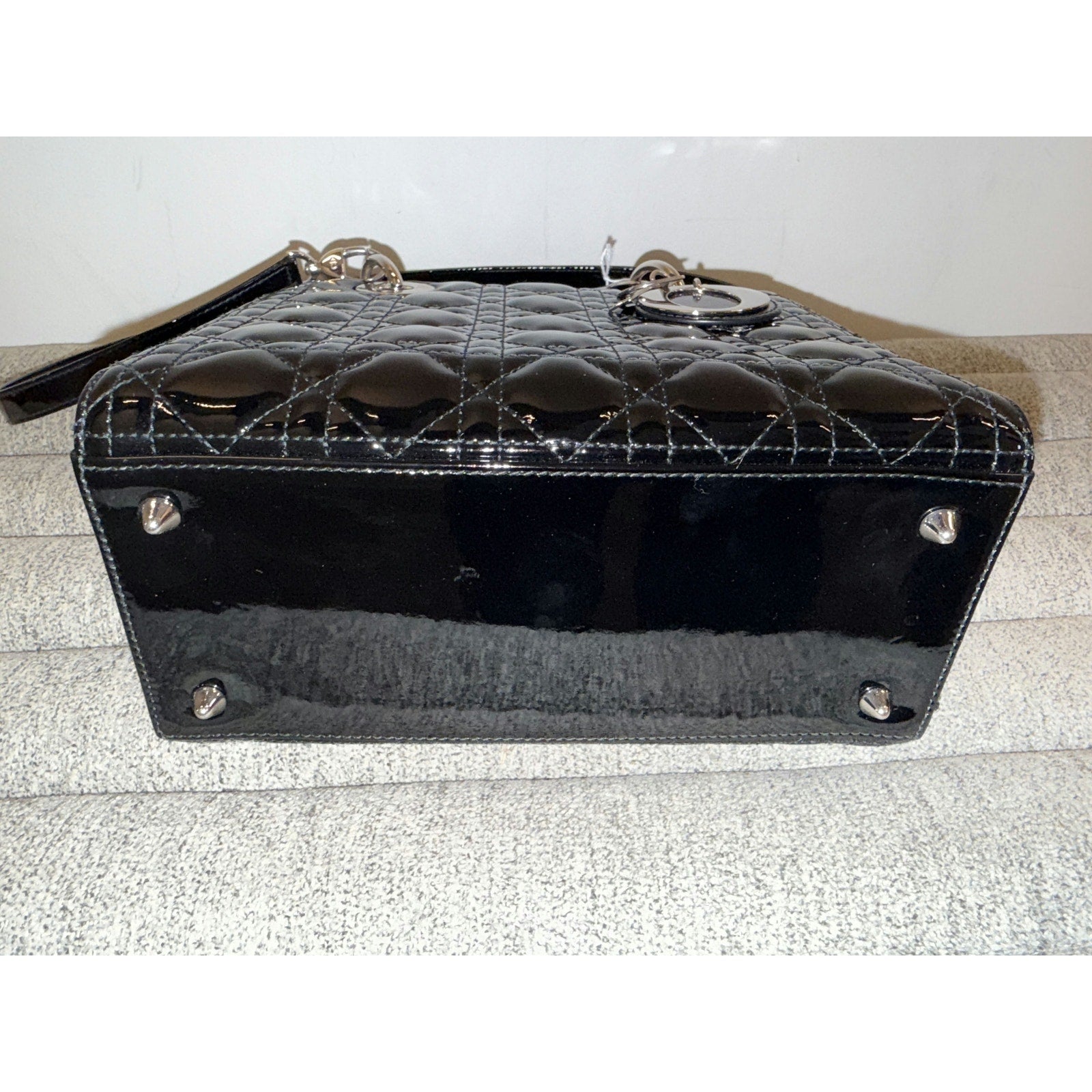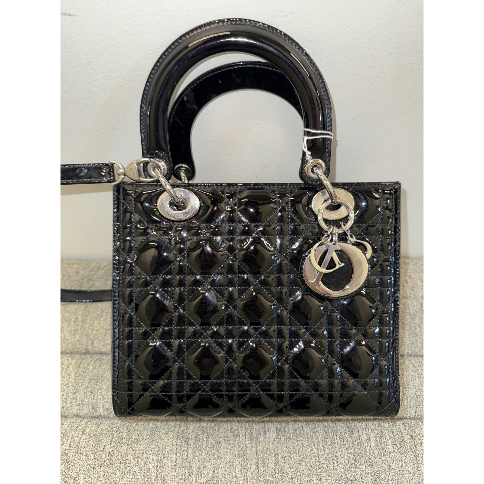 This elegant Lady Dior bag features the iconic quilted pattern and shiny patent leather, complete with silver-tone hardware. Its timeless design and sophisticated style make it a versatile accessory for any occasion.