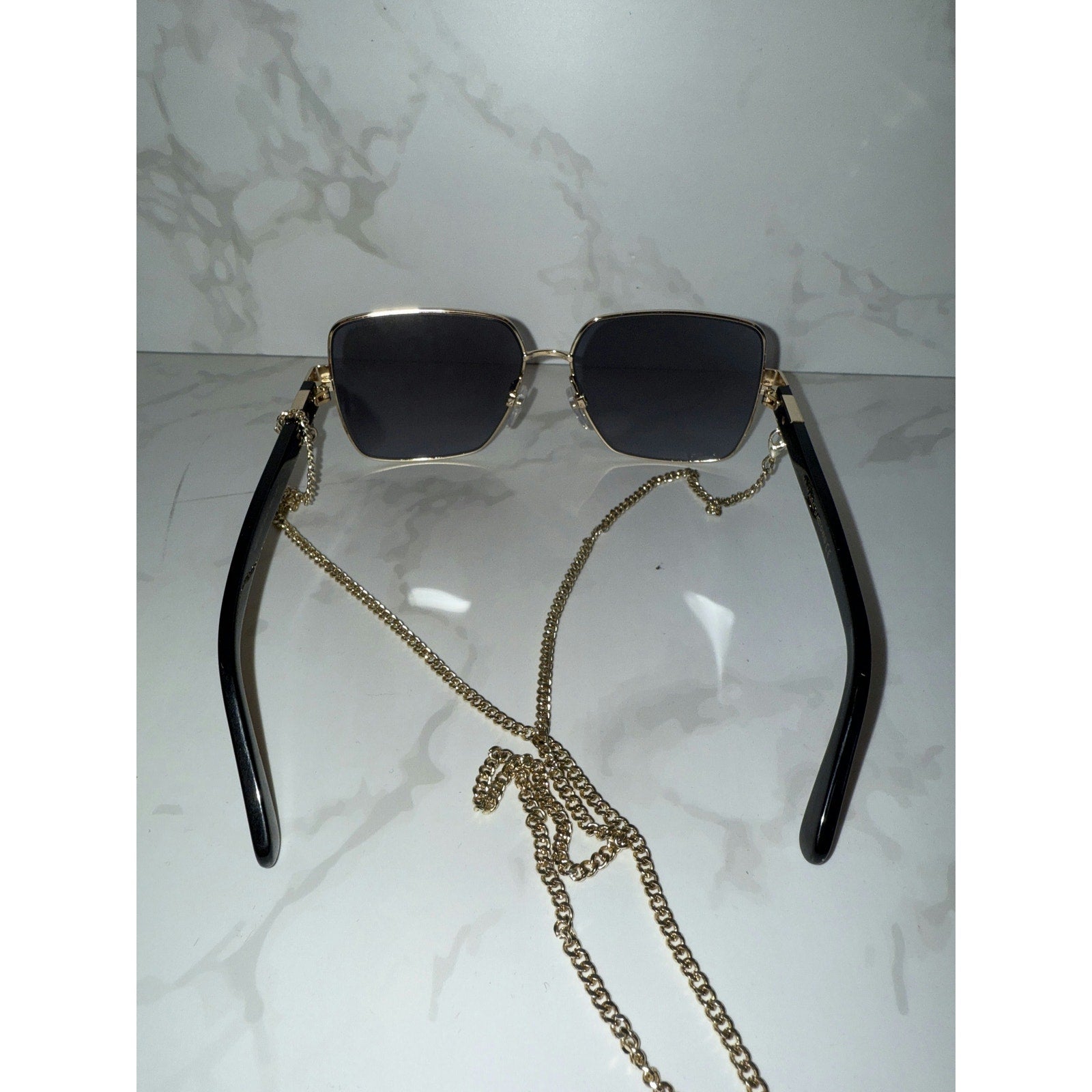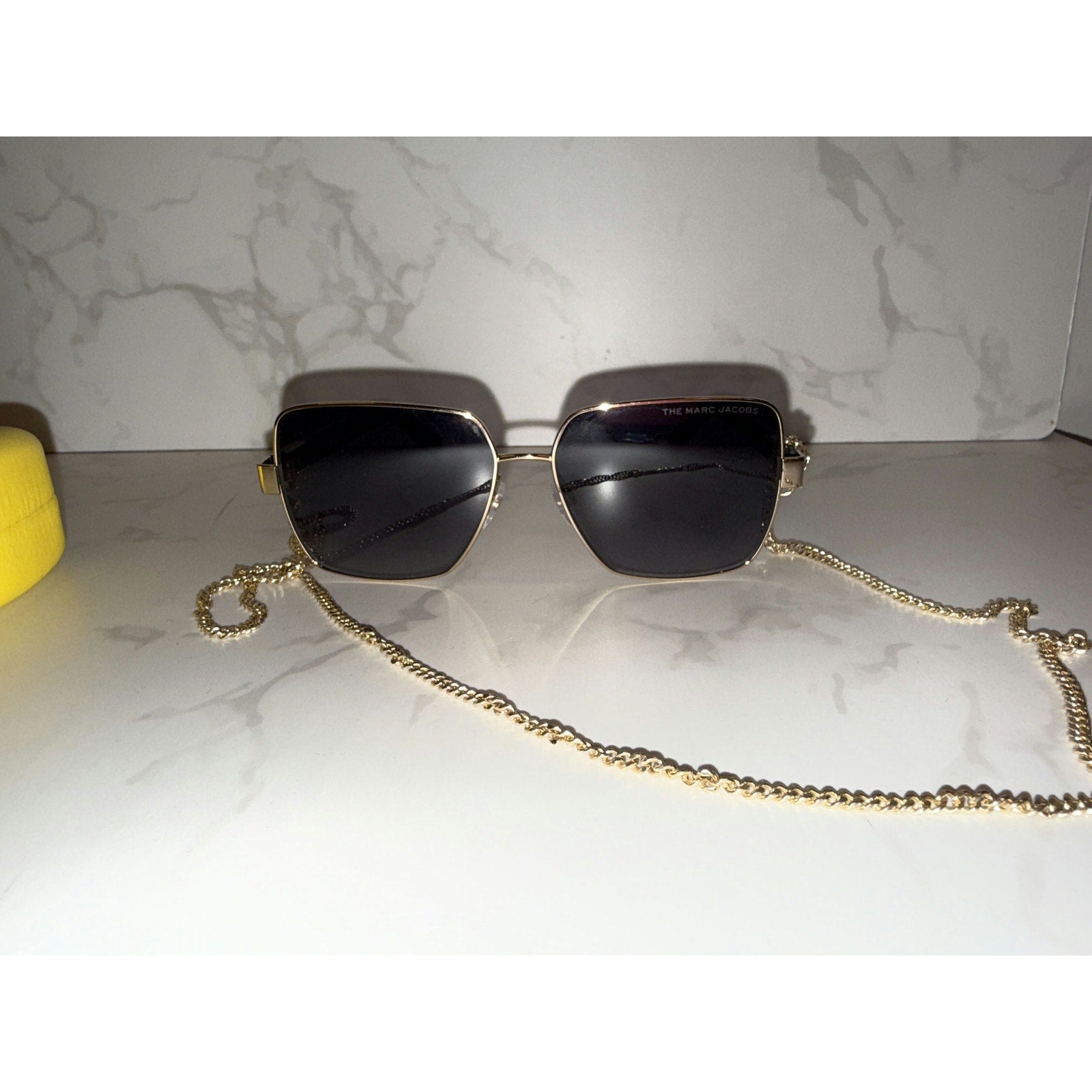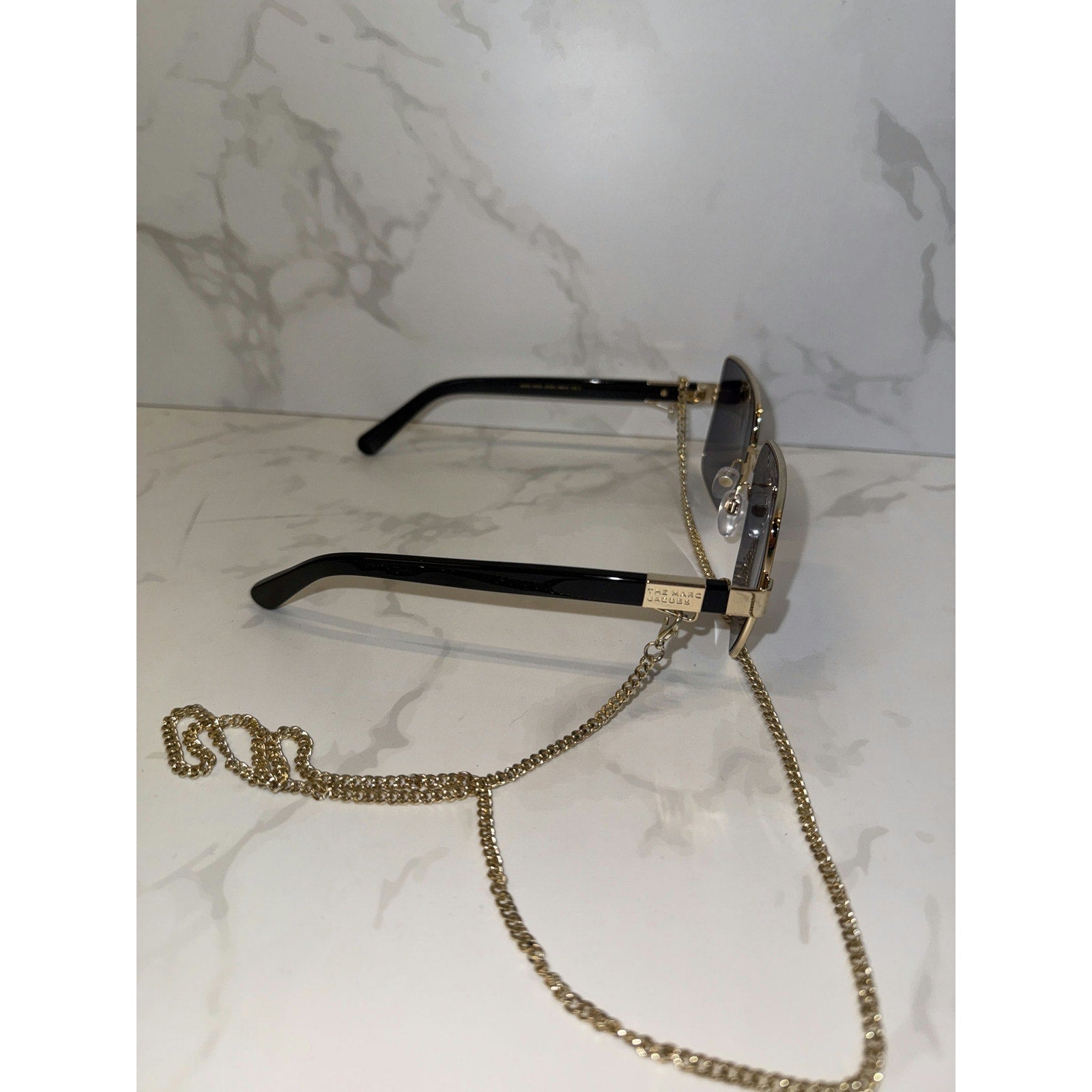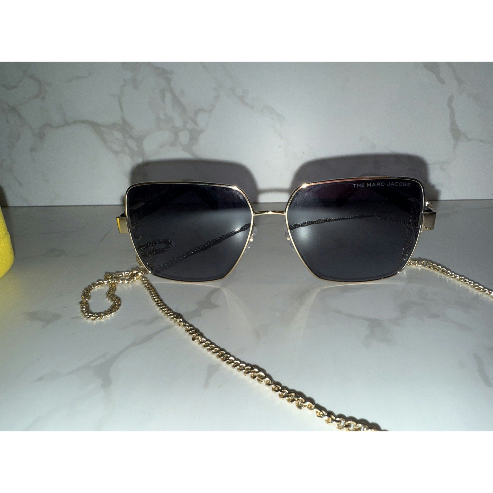 These stylish Marc Jacobs sunglasses feature a chic gold-tone chain and sleek black frames. The elegant design provides both fashion and functionality, making them a perfect accessory for any outfit.