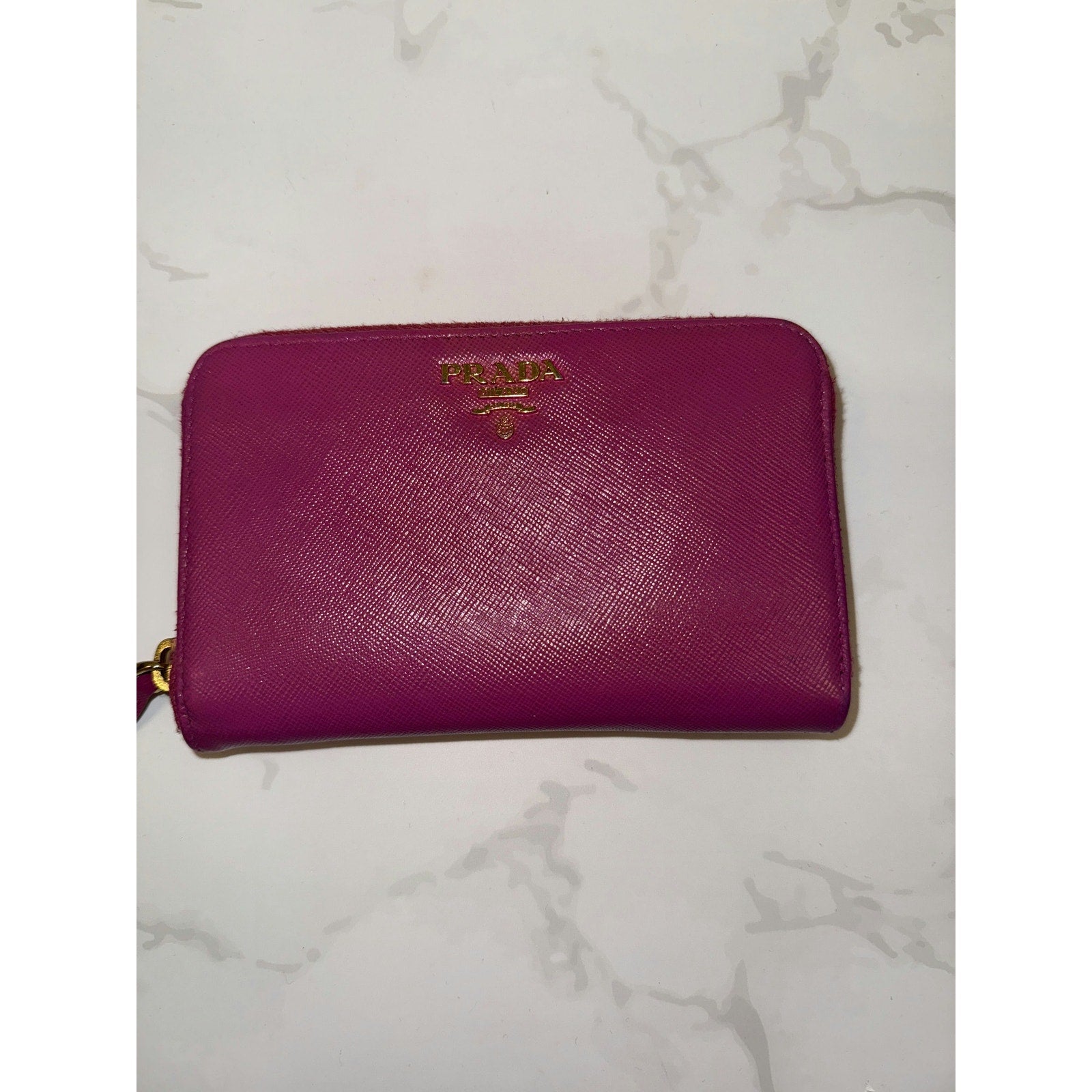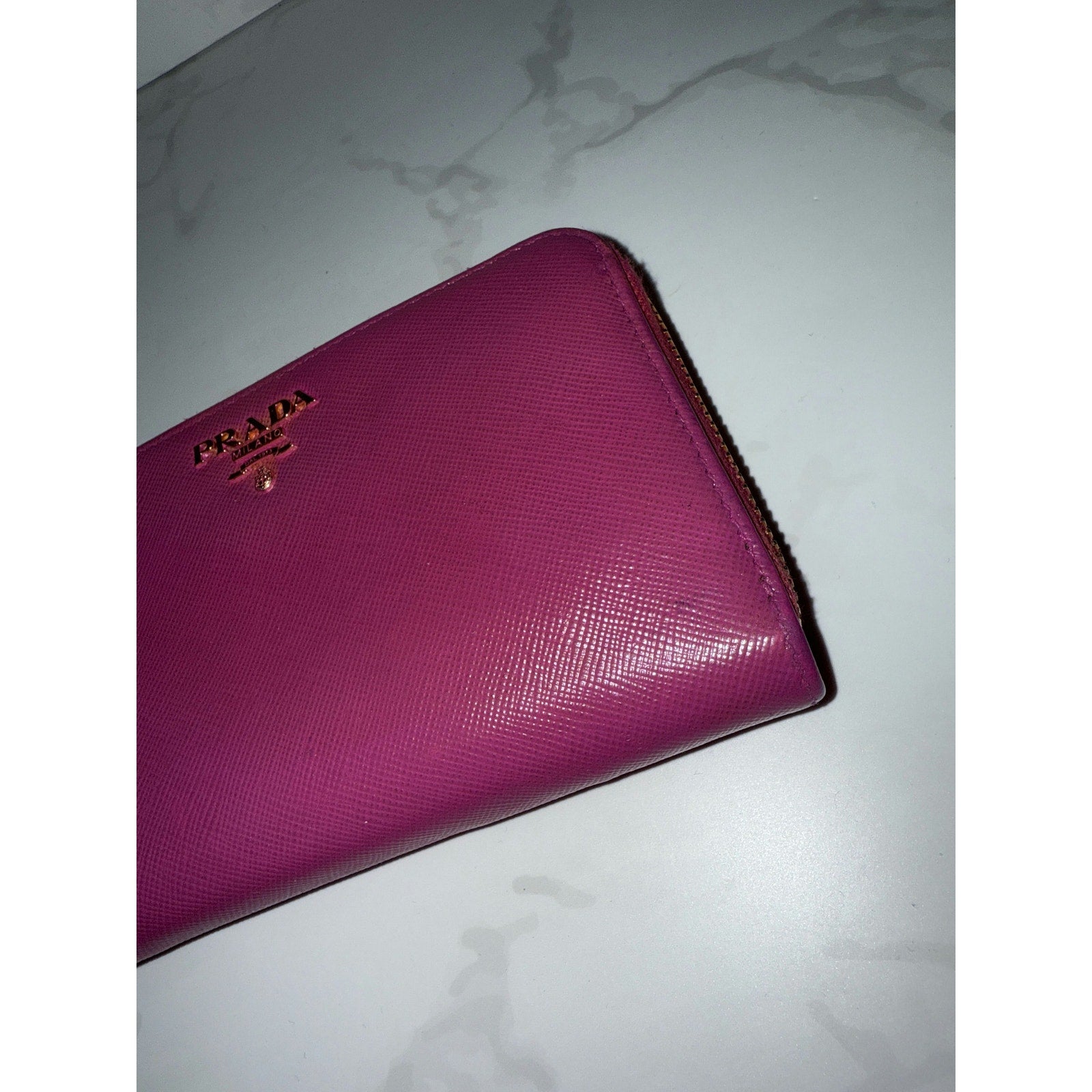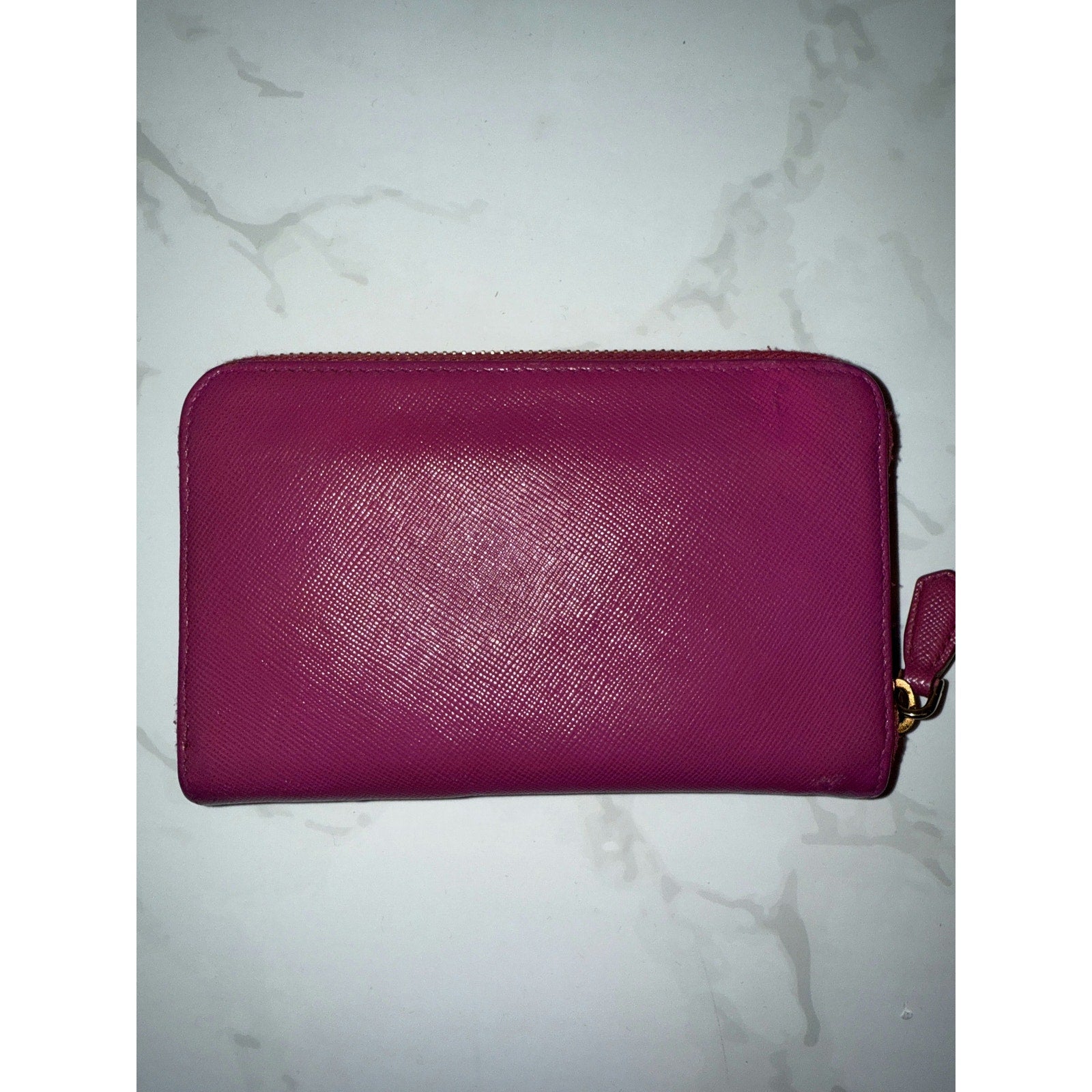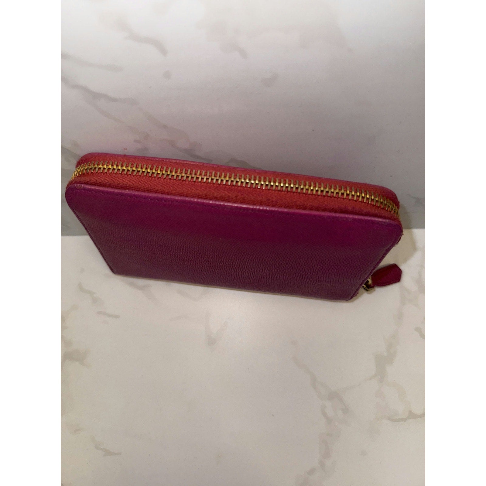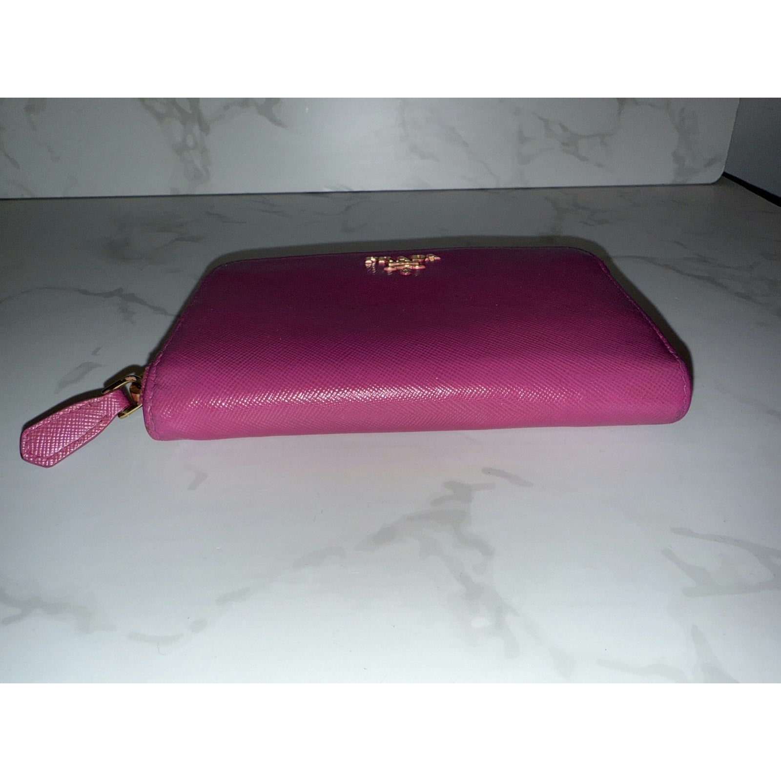 This vibrant Prada wallet in pink Saffiano leather offers both elegance and practicality. The zip-around design ensures security, while the interior provides ample space for cards and essentials.