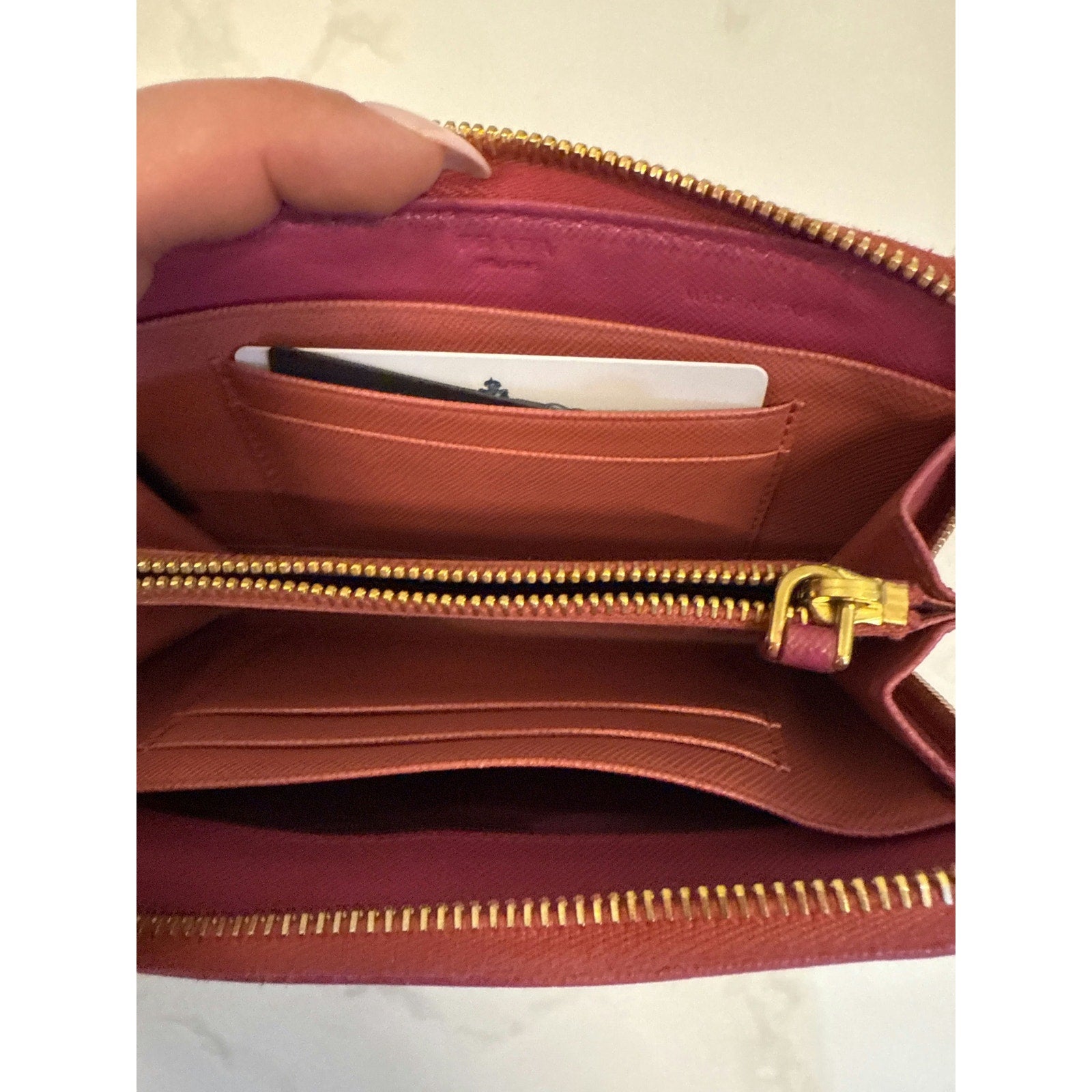 Features: Gold-tone hardware, multiple card slots, spacious compartments