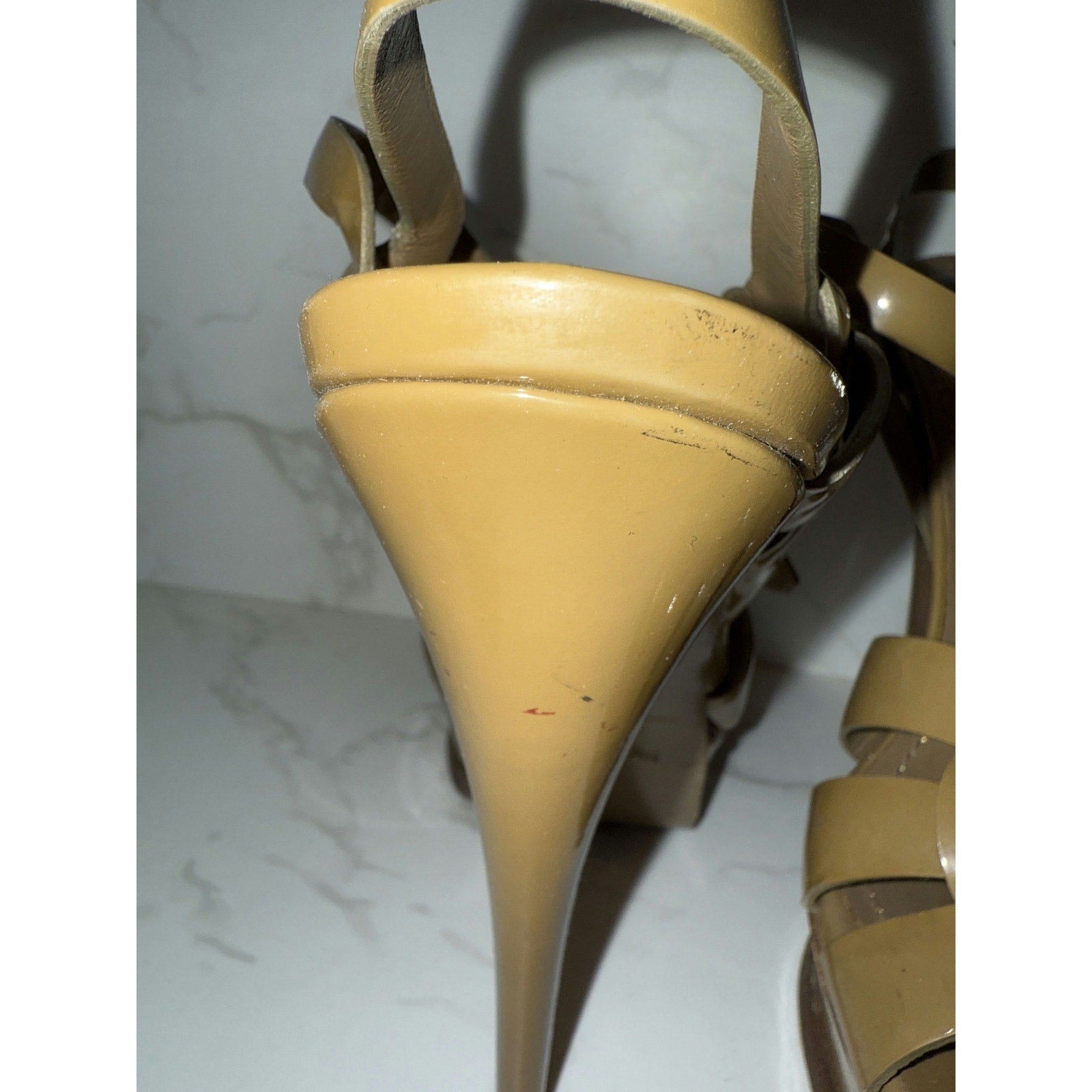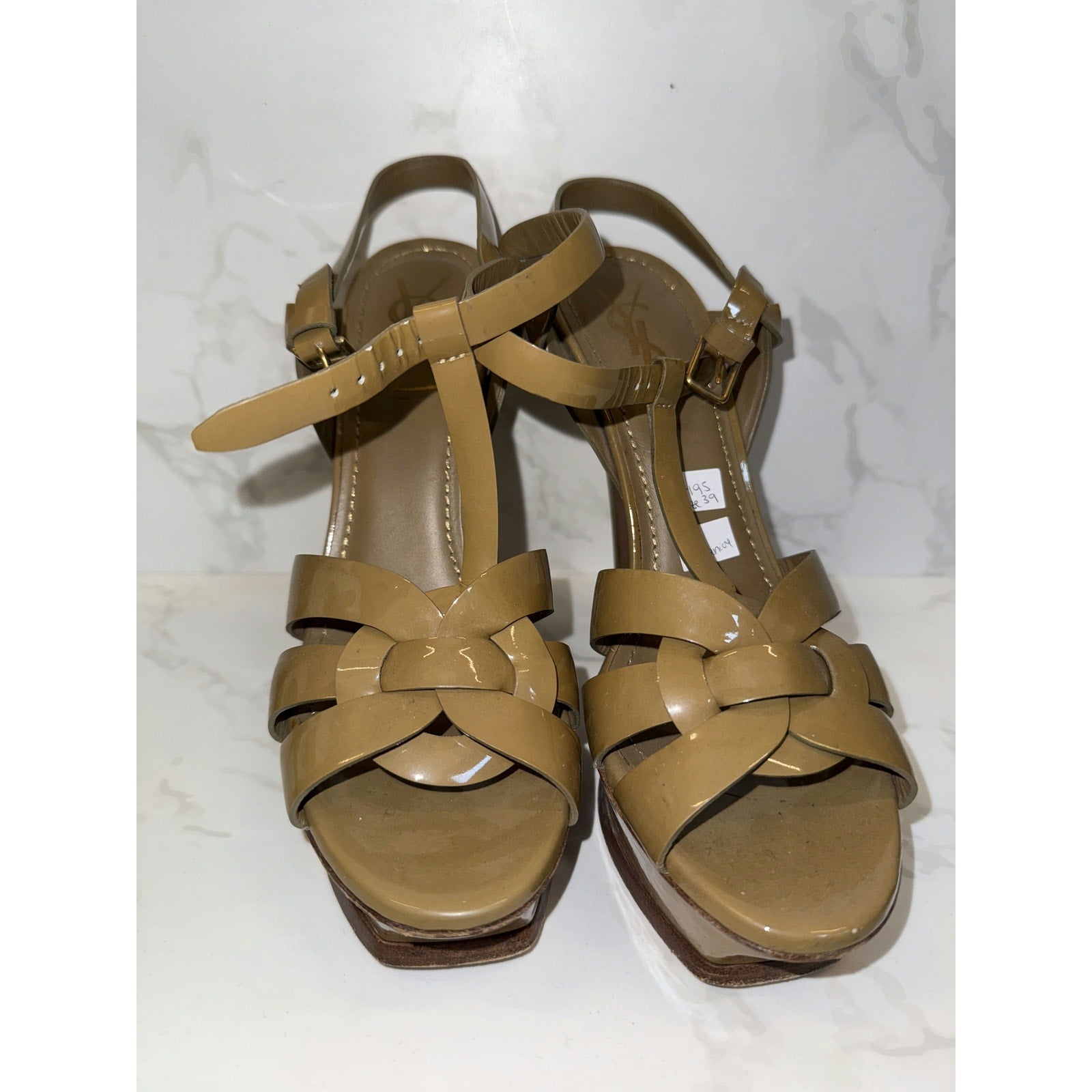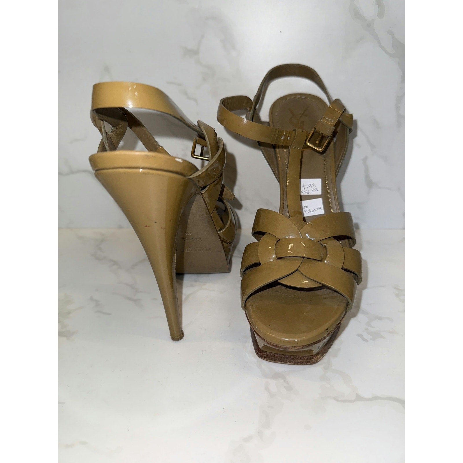 These YSL Tribute sandals feature the brand's signature woven design in a versatile tan color. While showing some signs of wear, they remain stylish and perfect for elevating any outfit with their classic look.