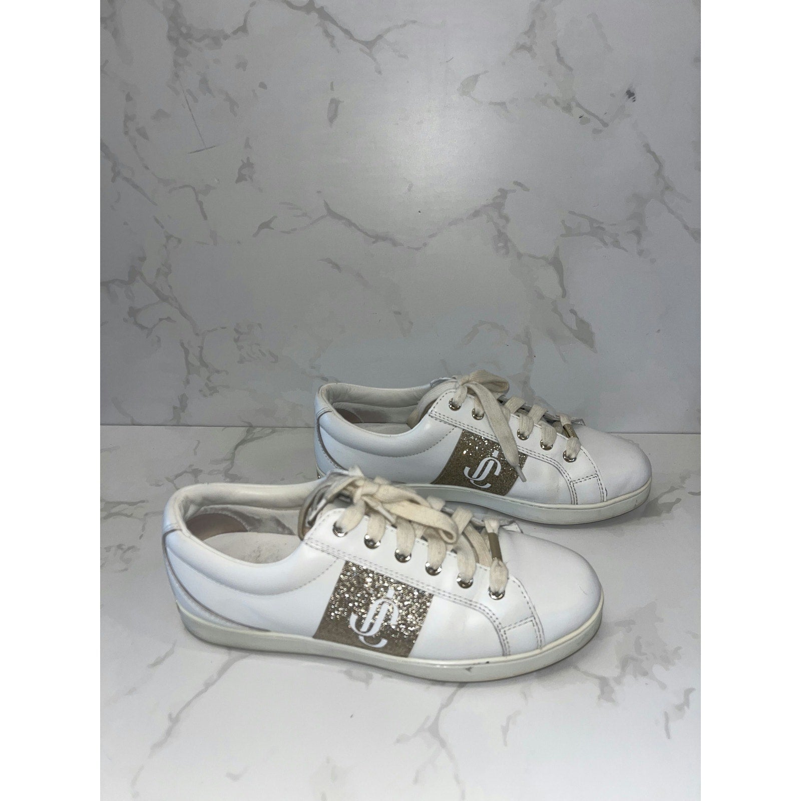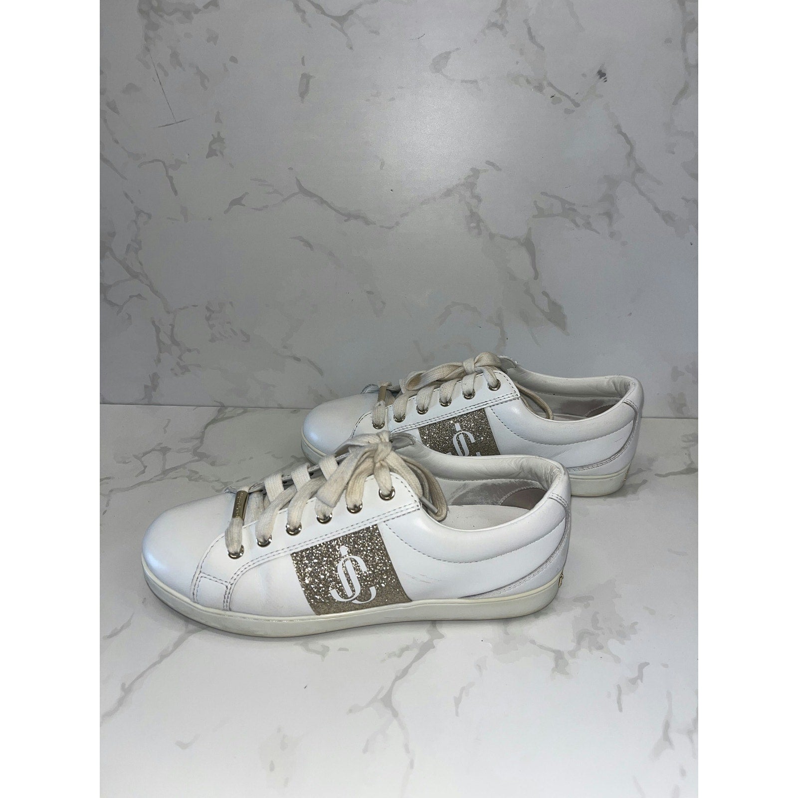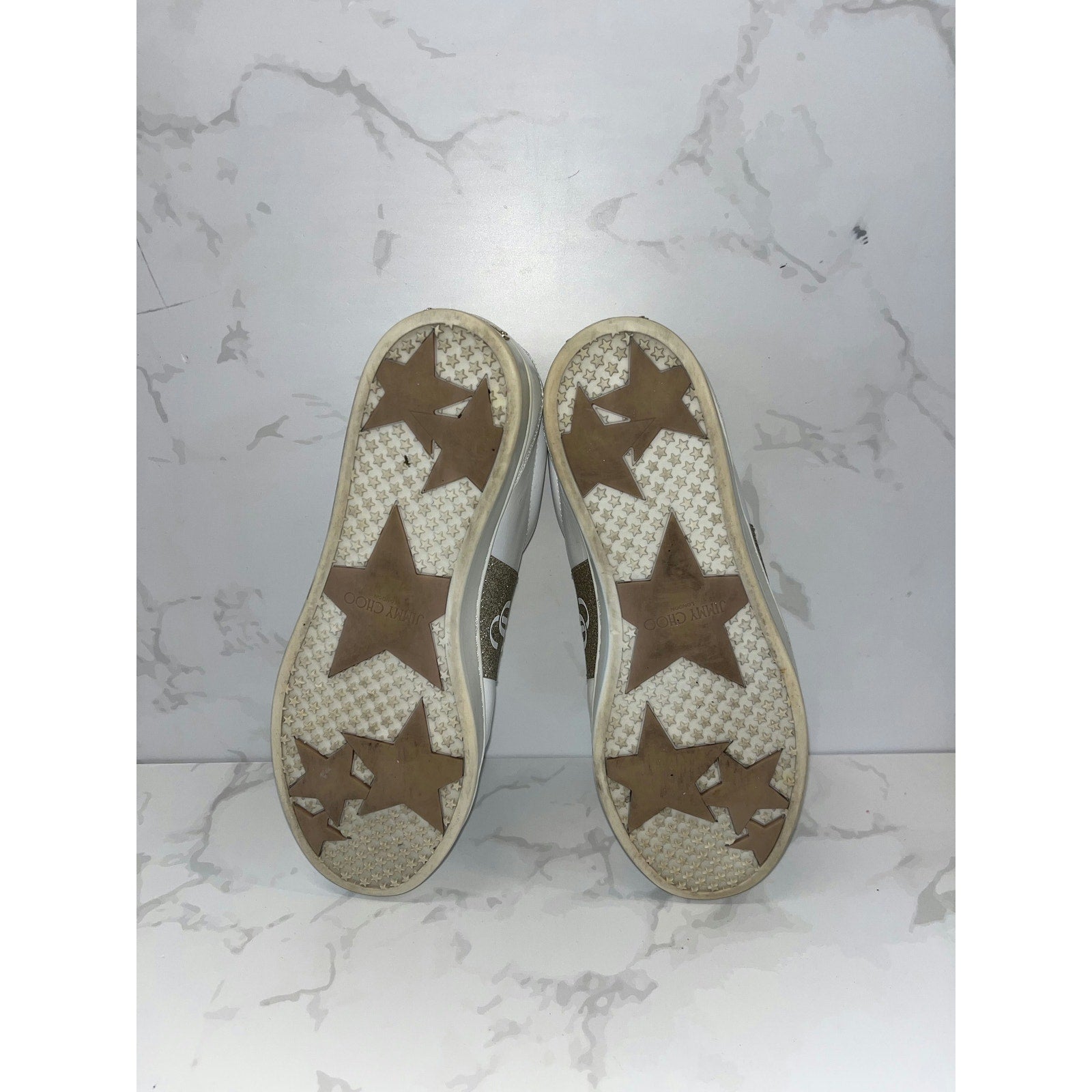 These Jimmy Choo sneakers offer a chic blend of comfort and style, featuring a sleek white leather design with eye-catching glitter accents. The star-patterned soles add a playful touch. In good condition, these sneakers come with the original box and dustbag, making them a versatile addition to any wardrobe. Step out in style with Jimmy Choo!