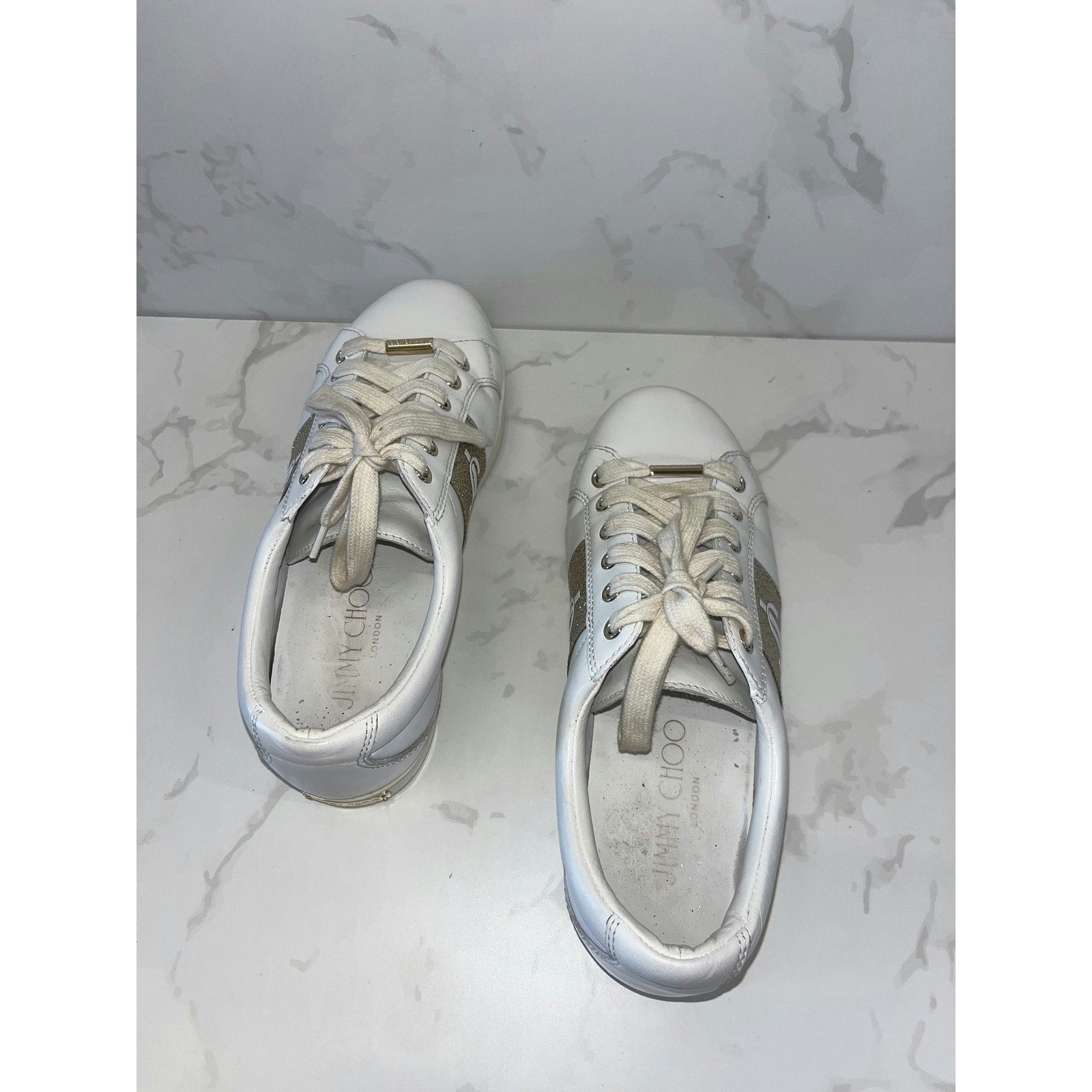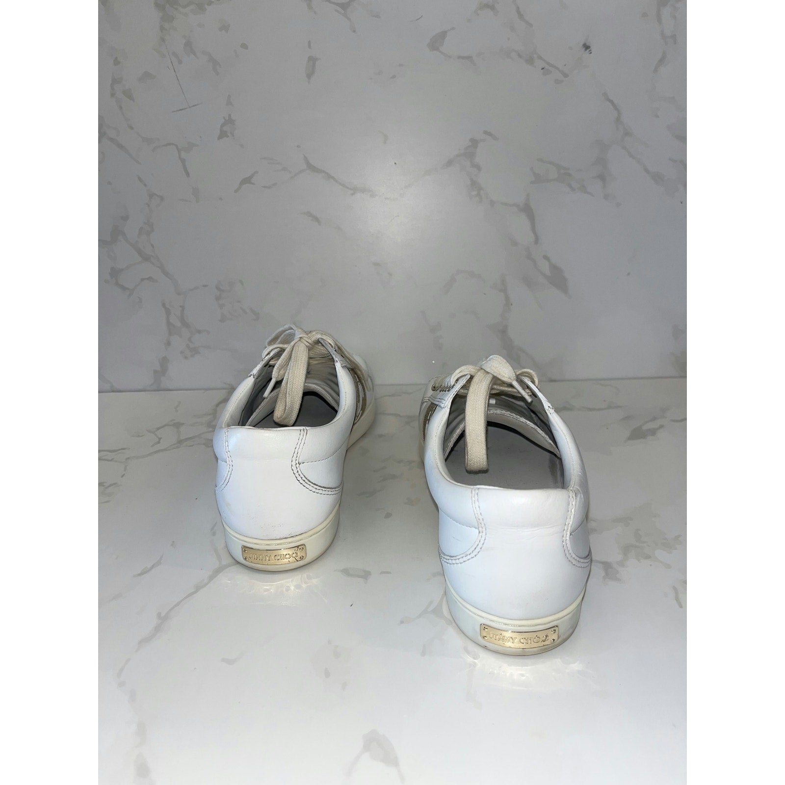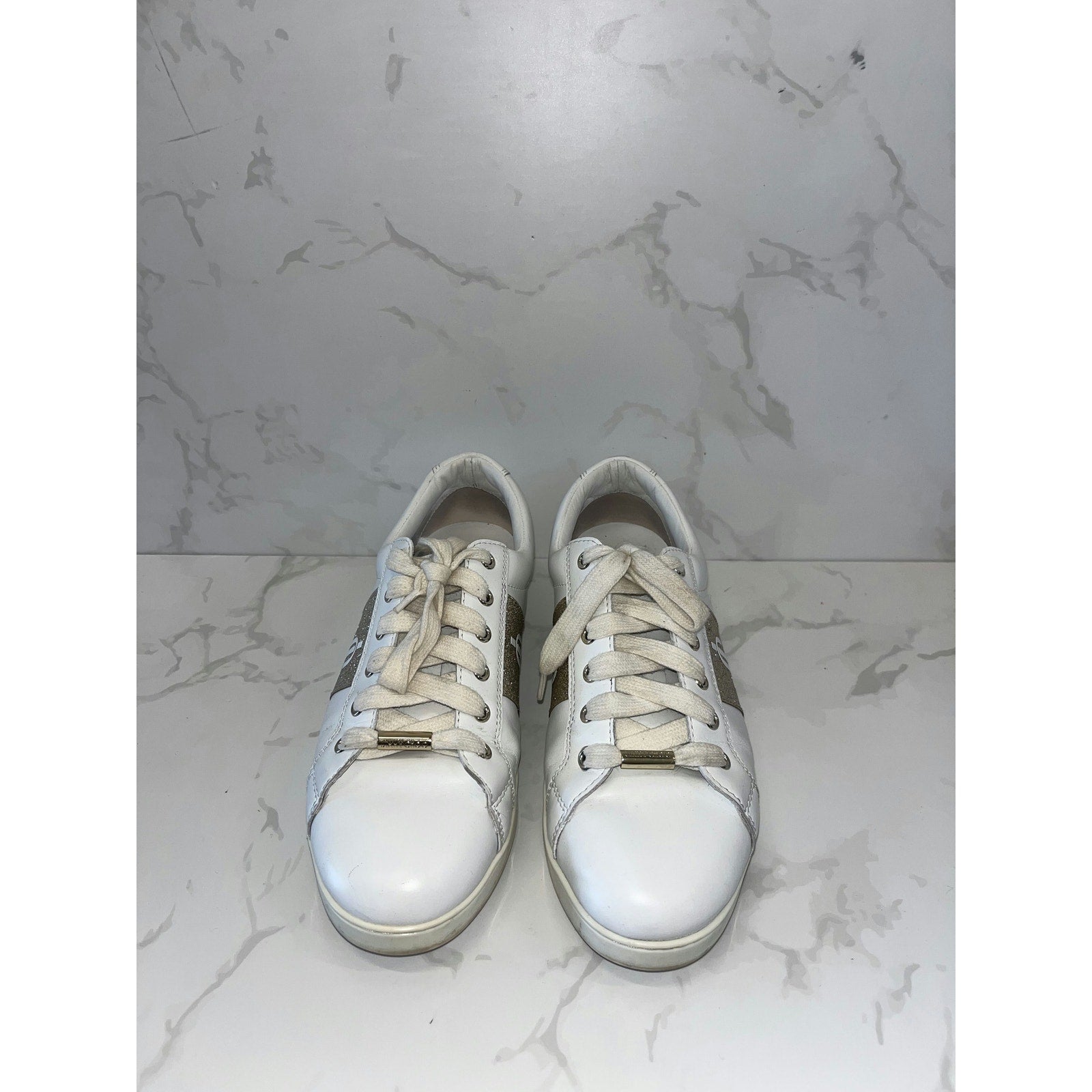 These Jimmy Choo sneakers offer a chic blend of comfort and style, featuring a sleek white leather design with eye-catching glitter accents. The star-patterned soles add a playful touch. In good condition, these sneakers come with the original box and dustbag, making them a versatile addition to any wardrobe. Step out in style with Jimmy Choo!