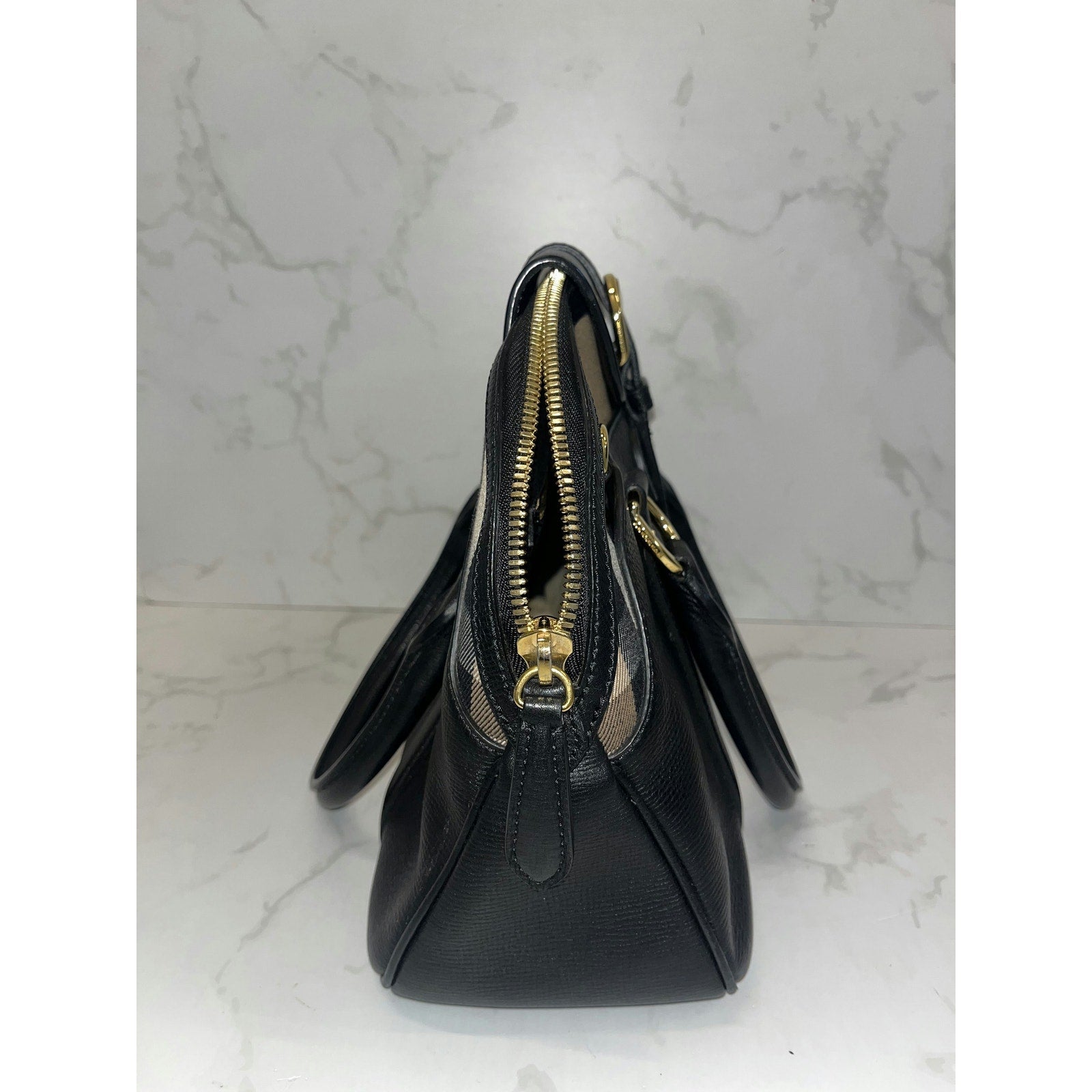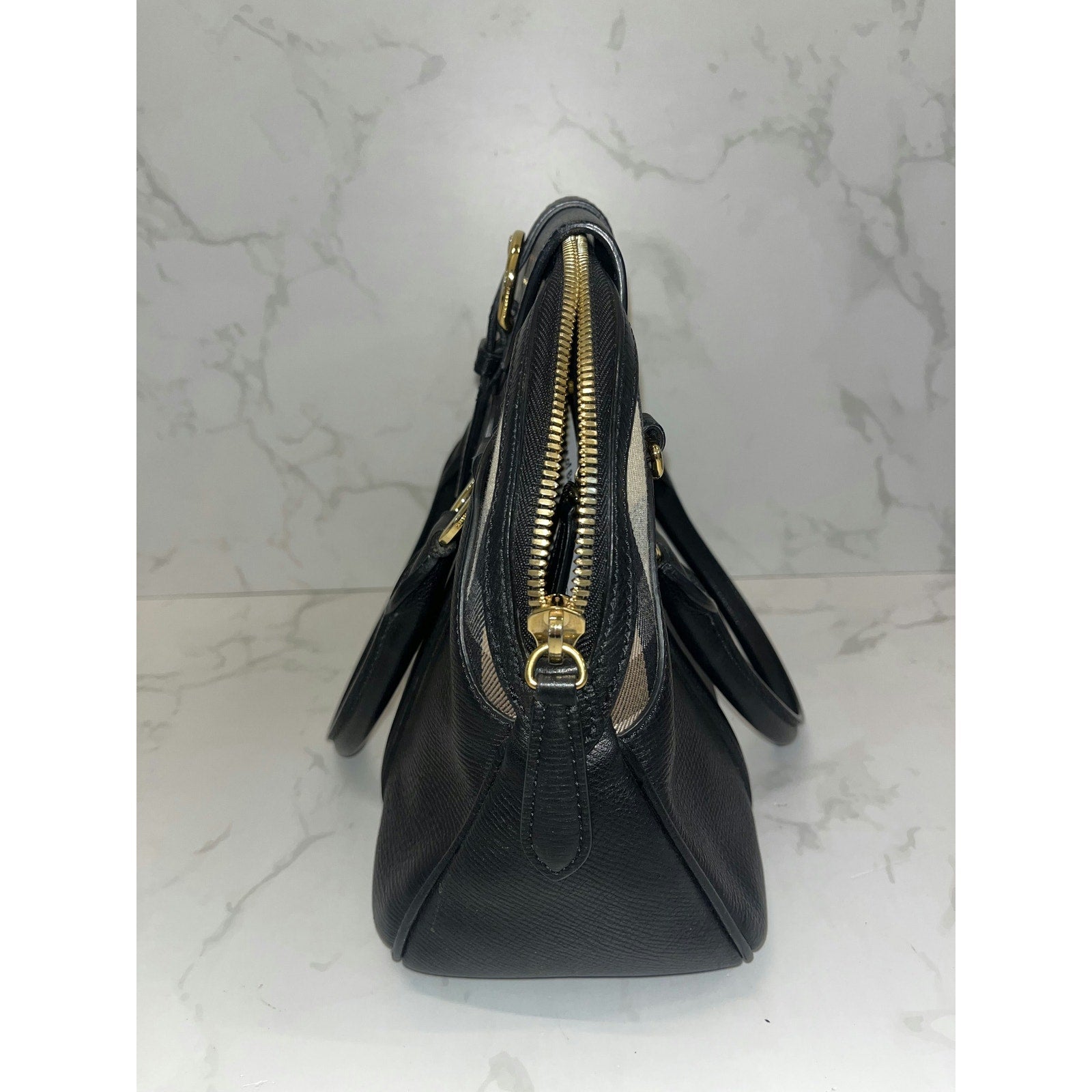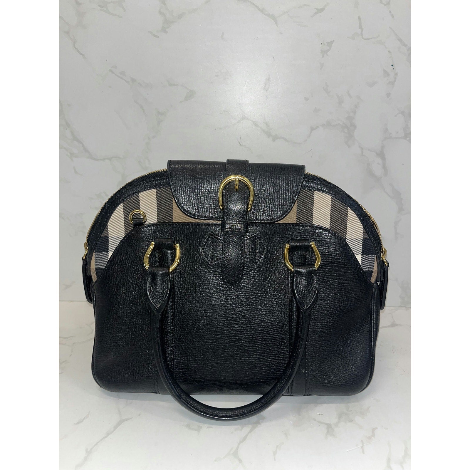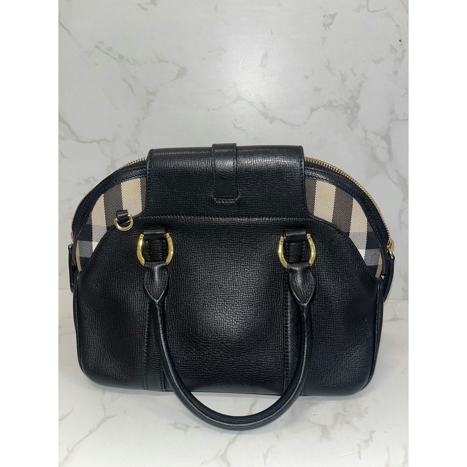 Elevate your style with this Burberry Black Leather Satchel. Featuring elegant checkered accents and gold-tone hardware, it's perfect for any occasion. With its spacious interior and classic design, this bag is both luxurious and practical. Add this timeless piece to your collection today!