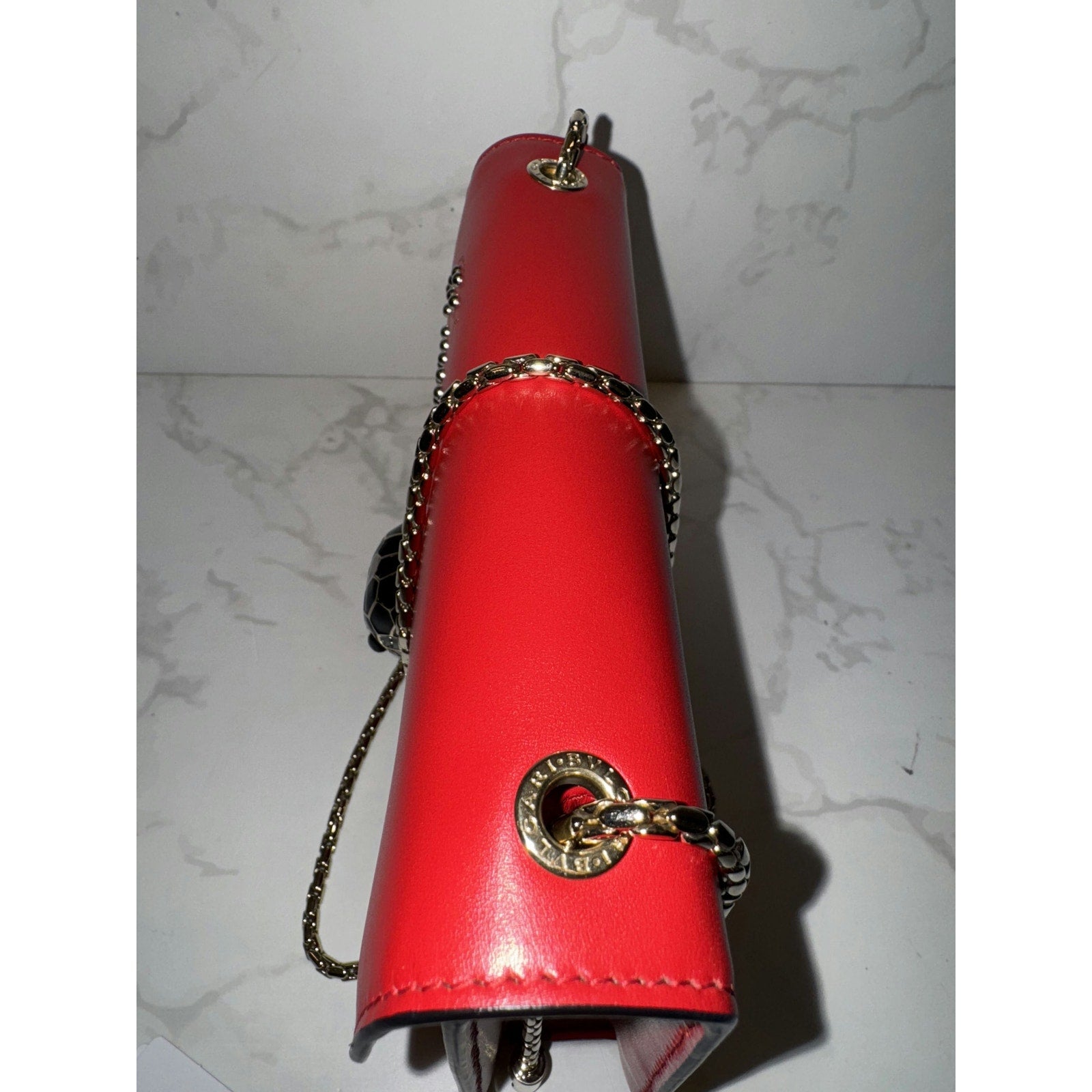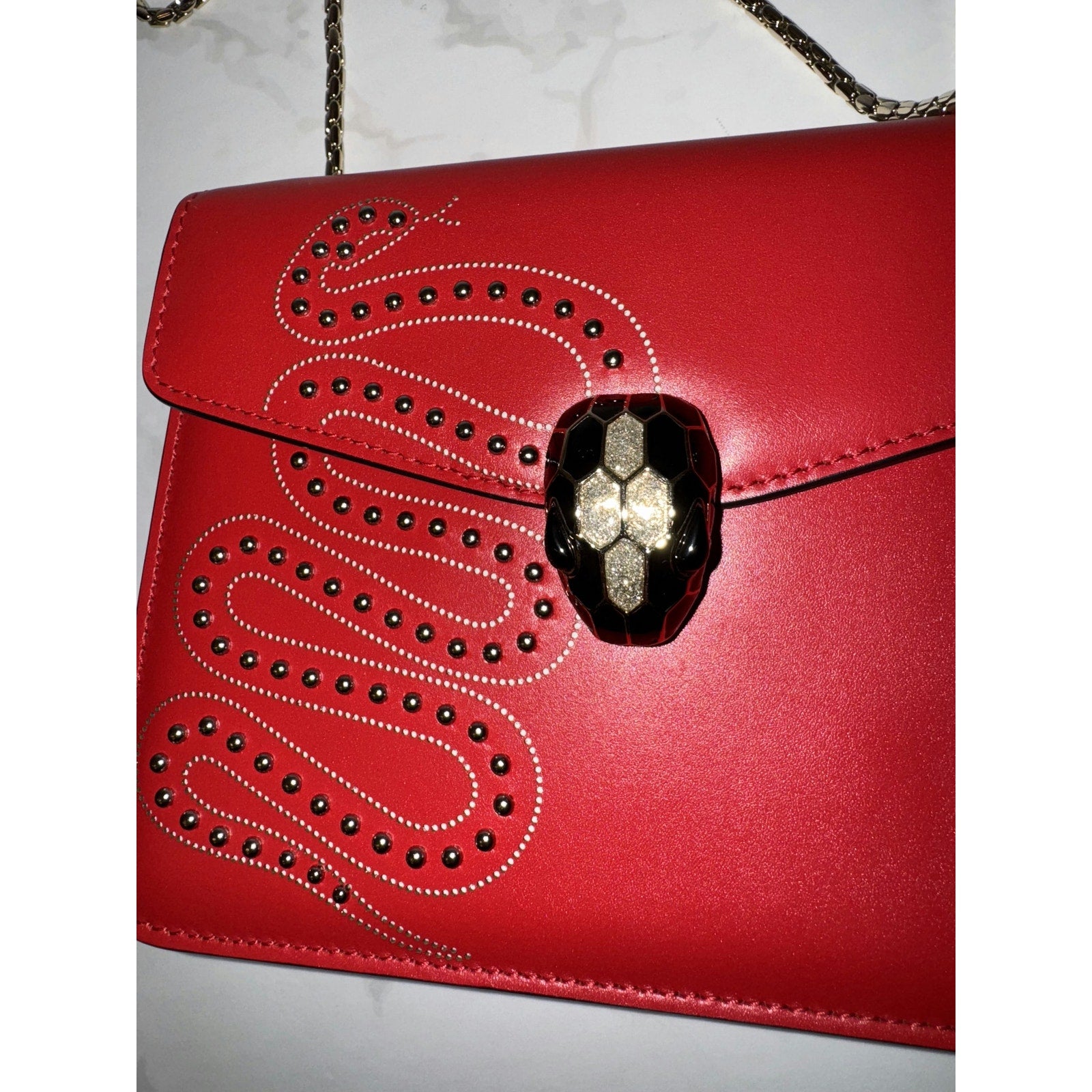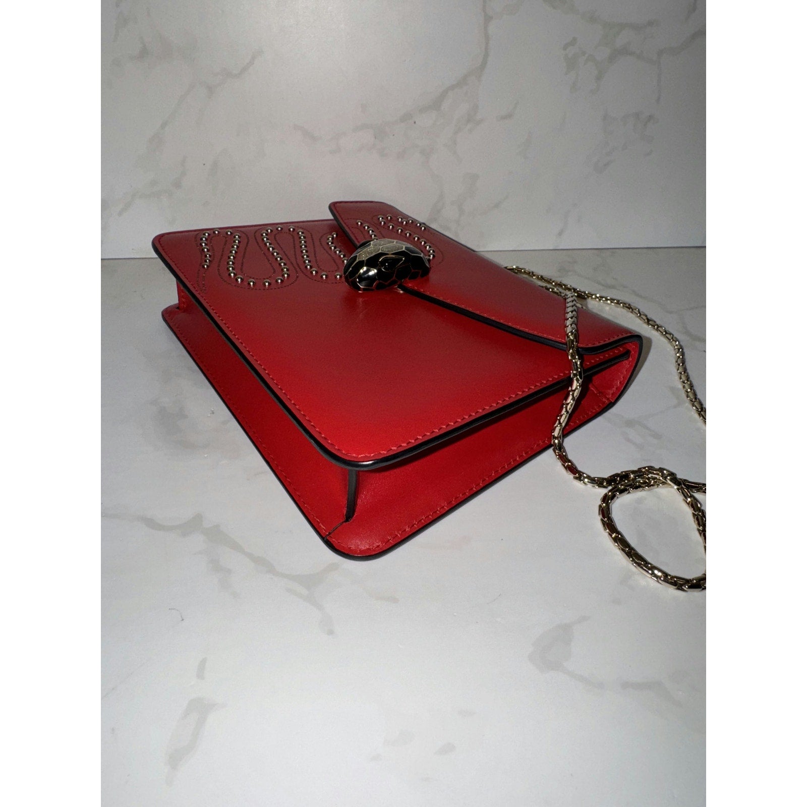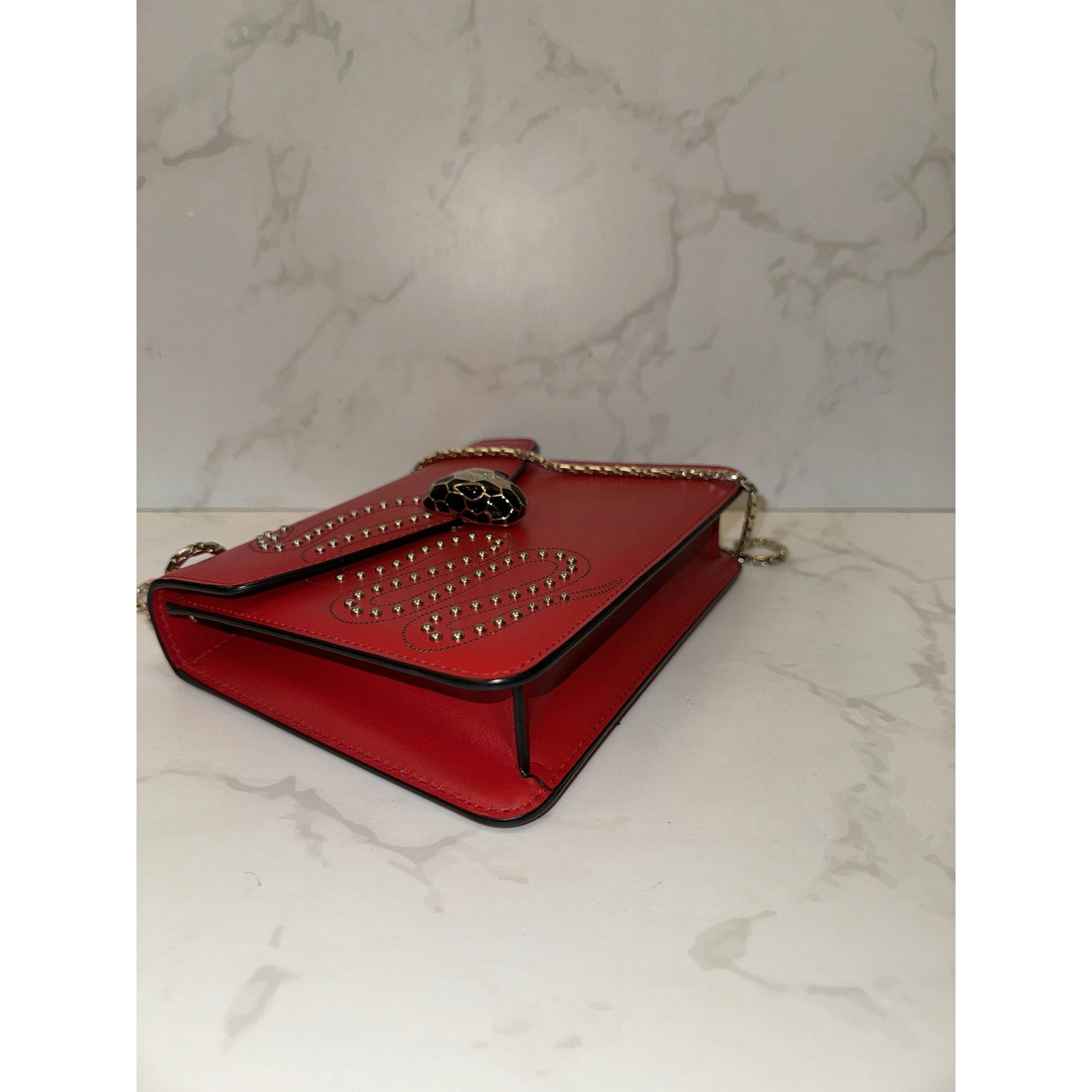 This stunning Bvlgari bag features the iconic Serpenti head closure with elegant stud detailing. Perfect for adding a bold statement to any outfit, it combines luxury and style effortlessly. Elevate your collection with this exquisite piece!