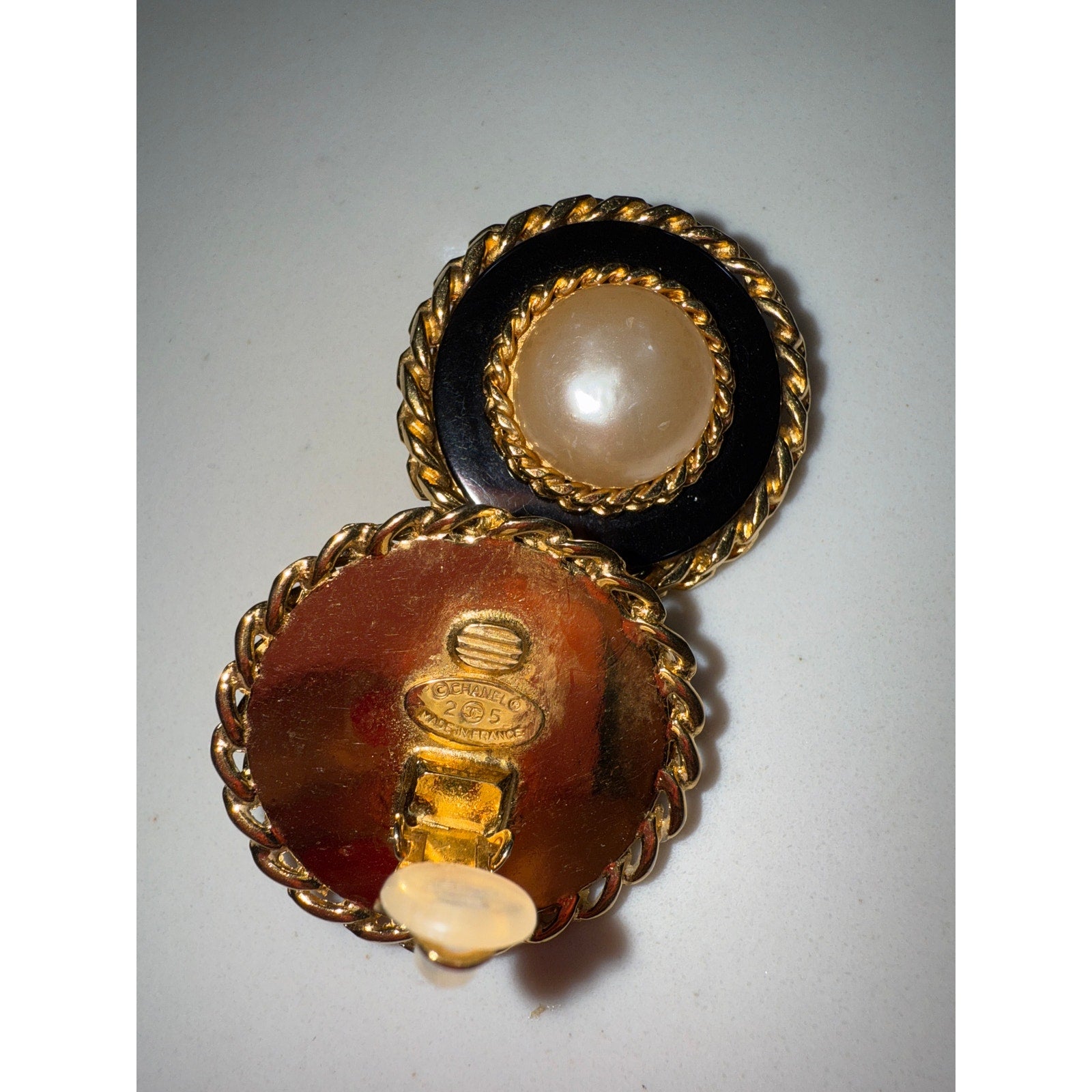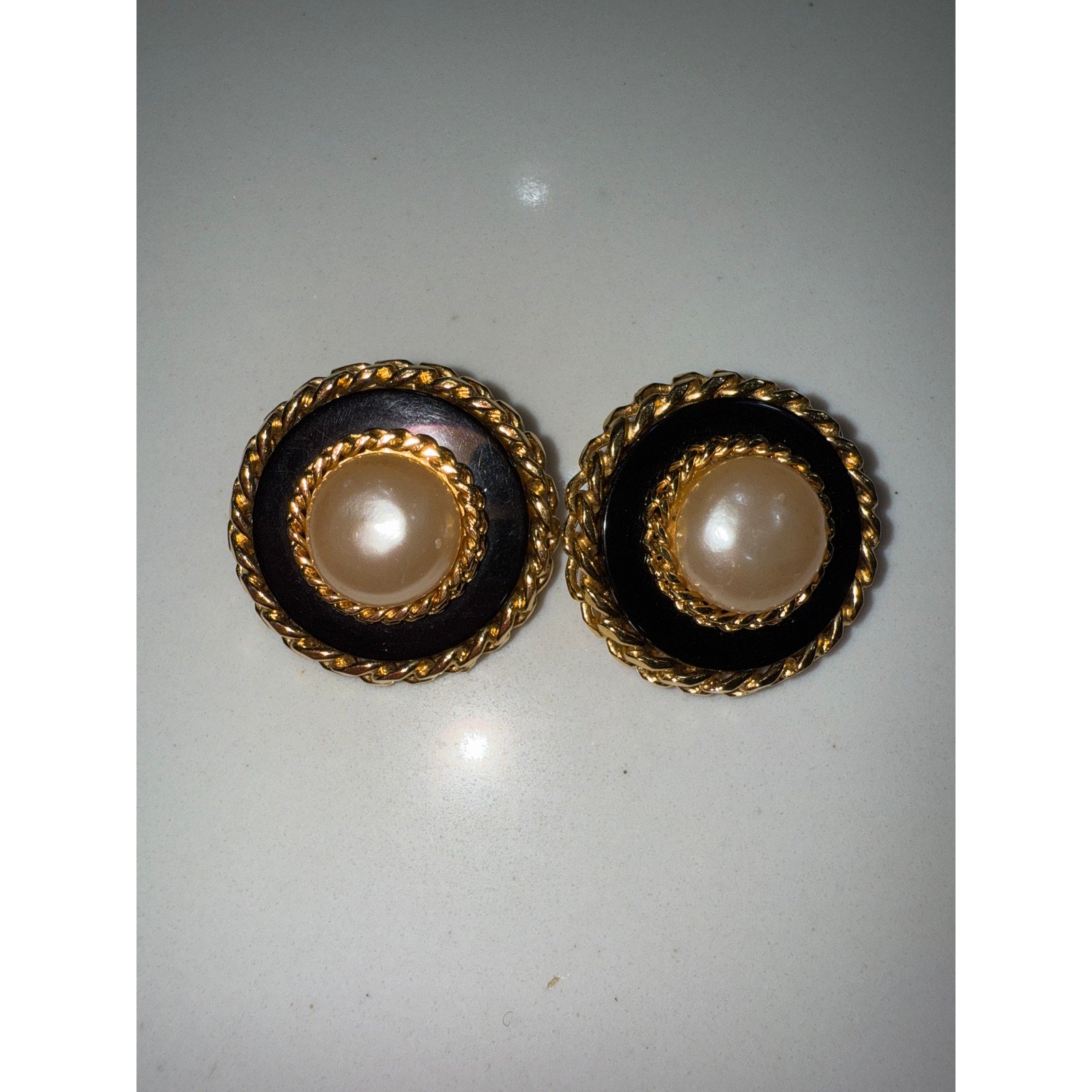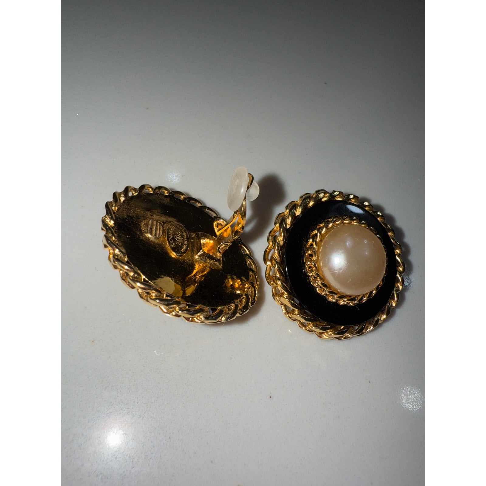 Classic Chanel earrings featuring a faux pearl center surrounded by black enamel and gold-tone rope trim border. Clip-on style with signature Chanel design details.