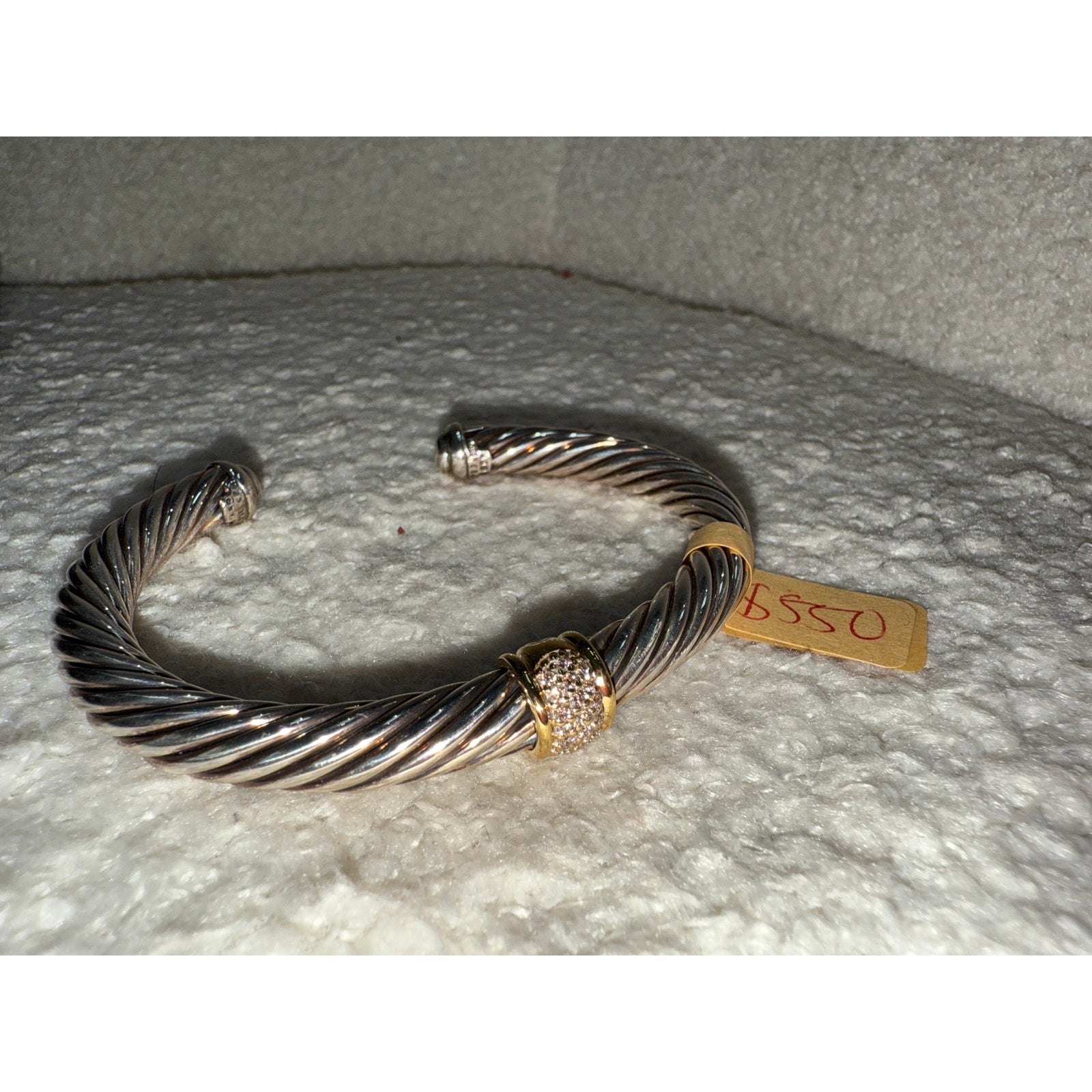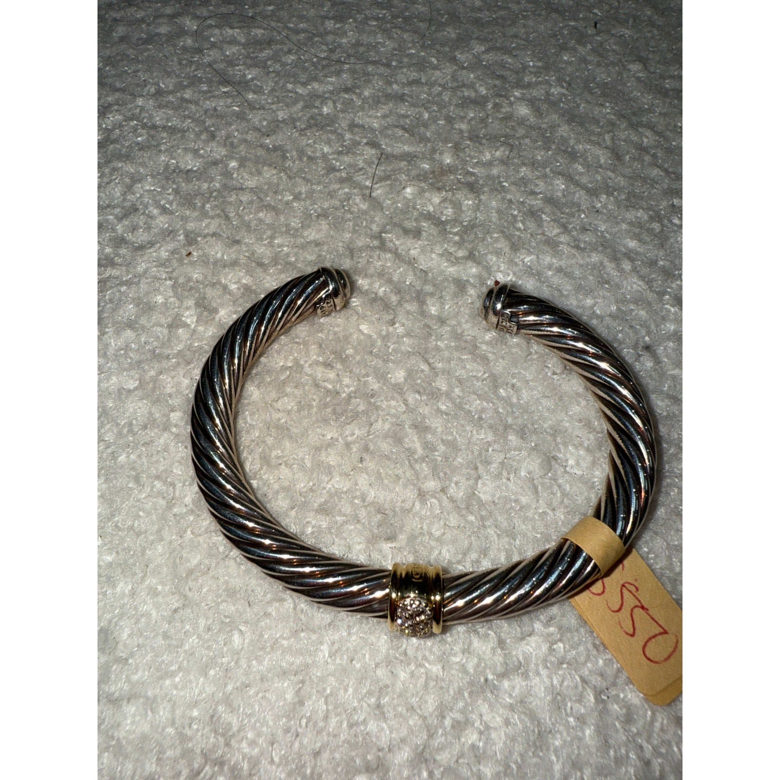 This iconic David Yurman cable bracelet features a sterling silver twisted design with gold accents and a diamond-encrusted center. A timeless piece, perfect for adding elegance and sophistication to any ensemble.