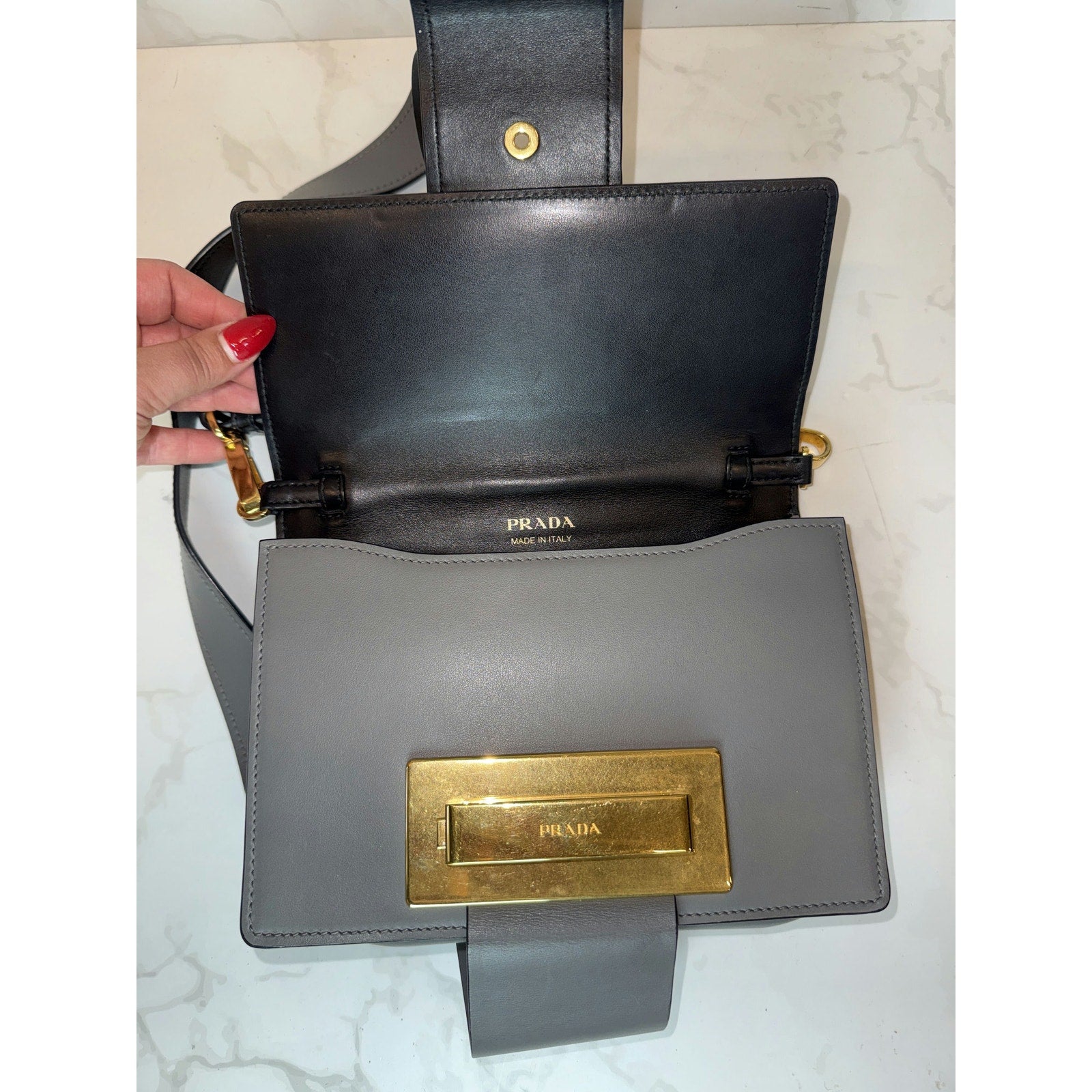 This elegant Prada crossbody bag offers a sophisticated and modern design, perfect for both casual and formal occasions. Its luxurious materials and iconic style make it a versatile accessory.