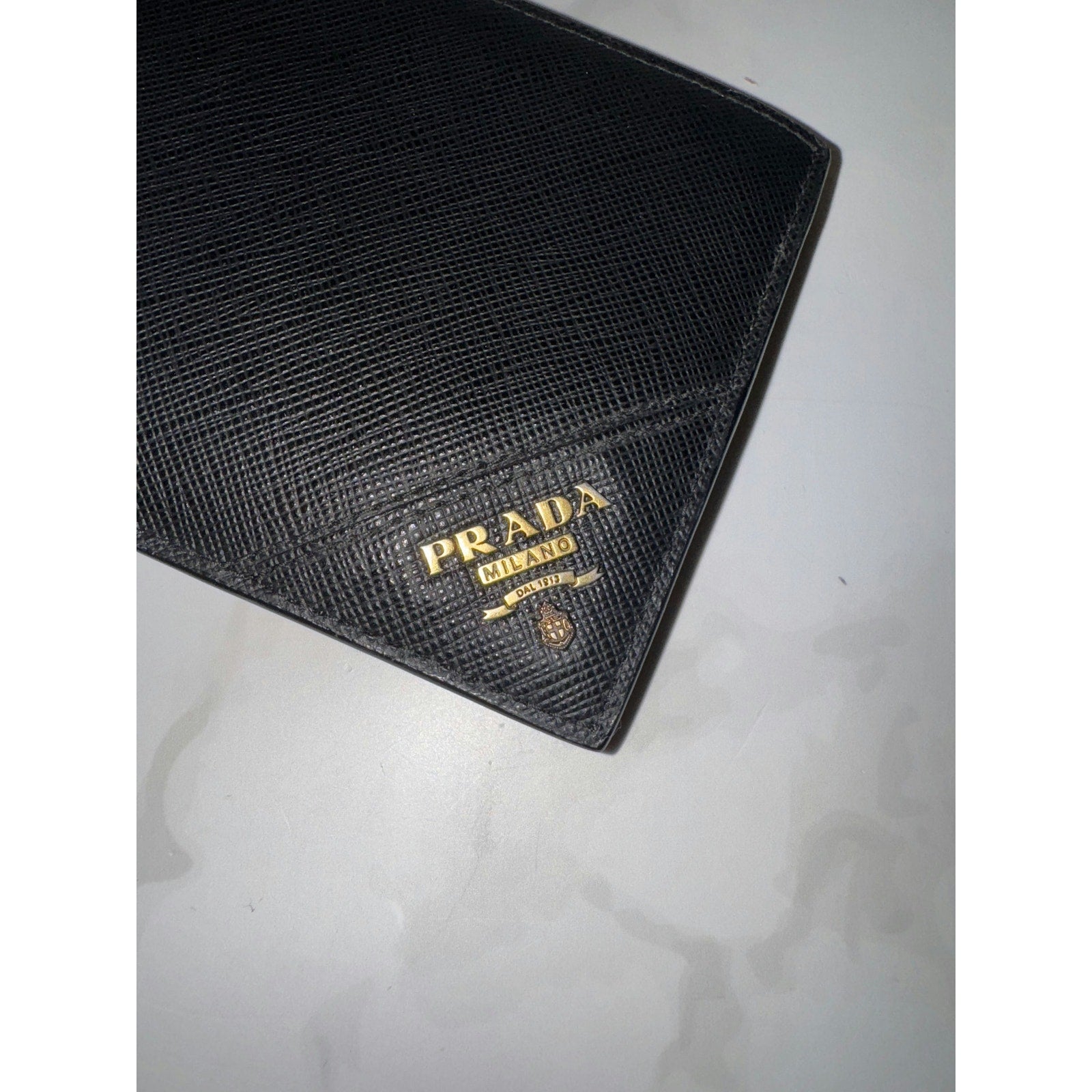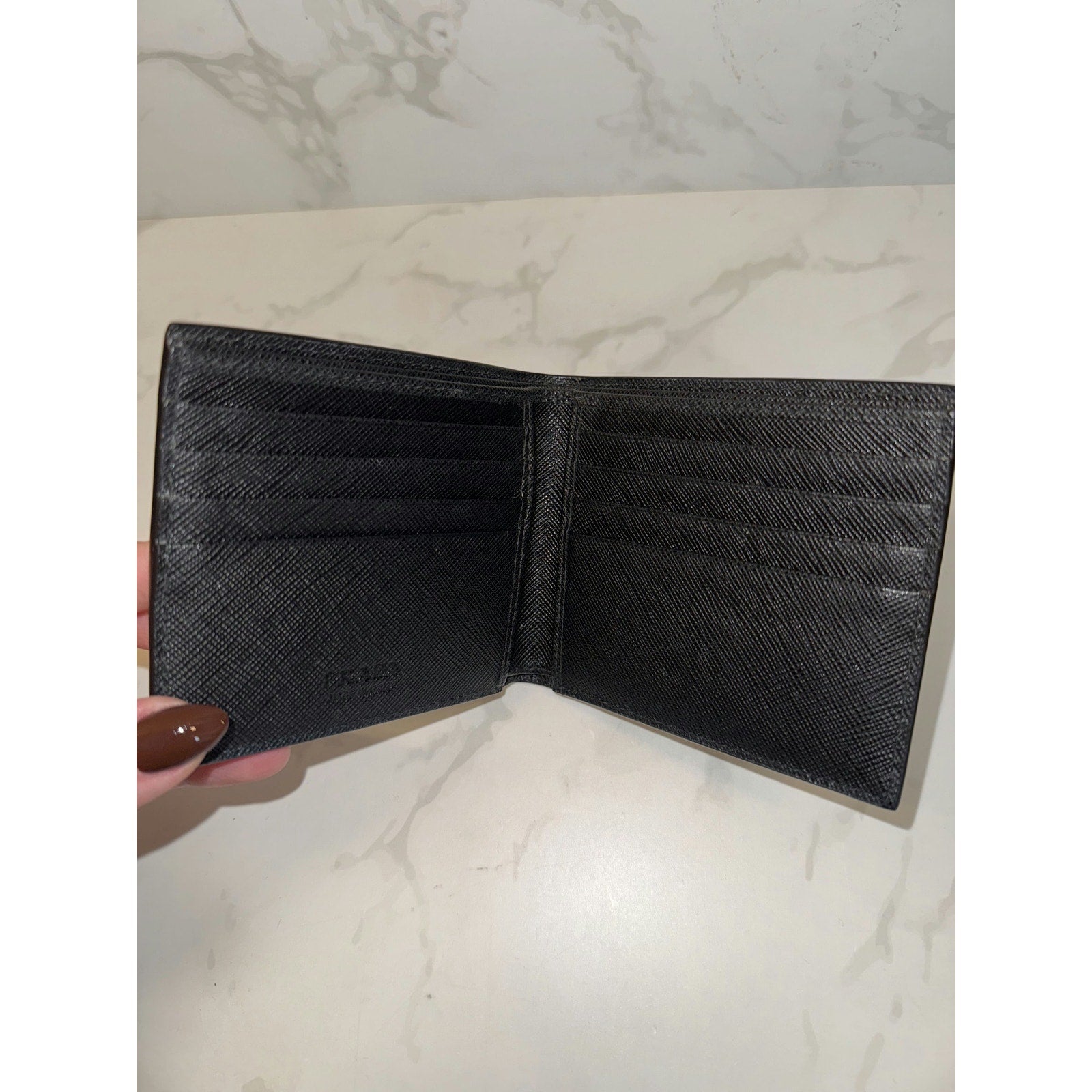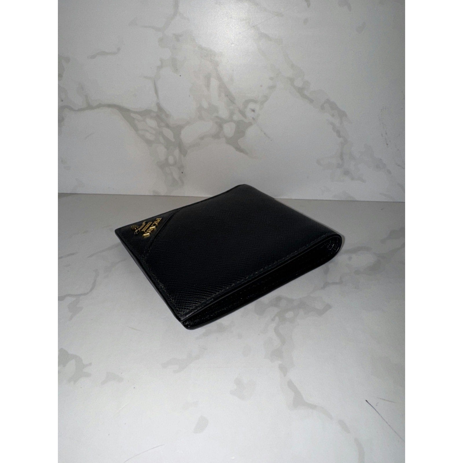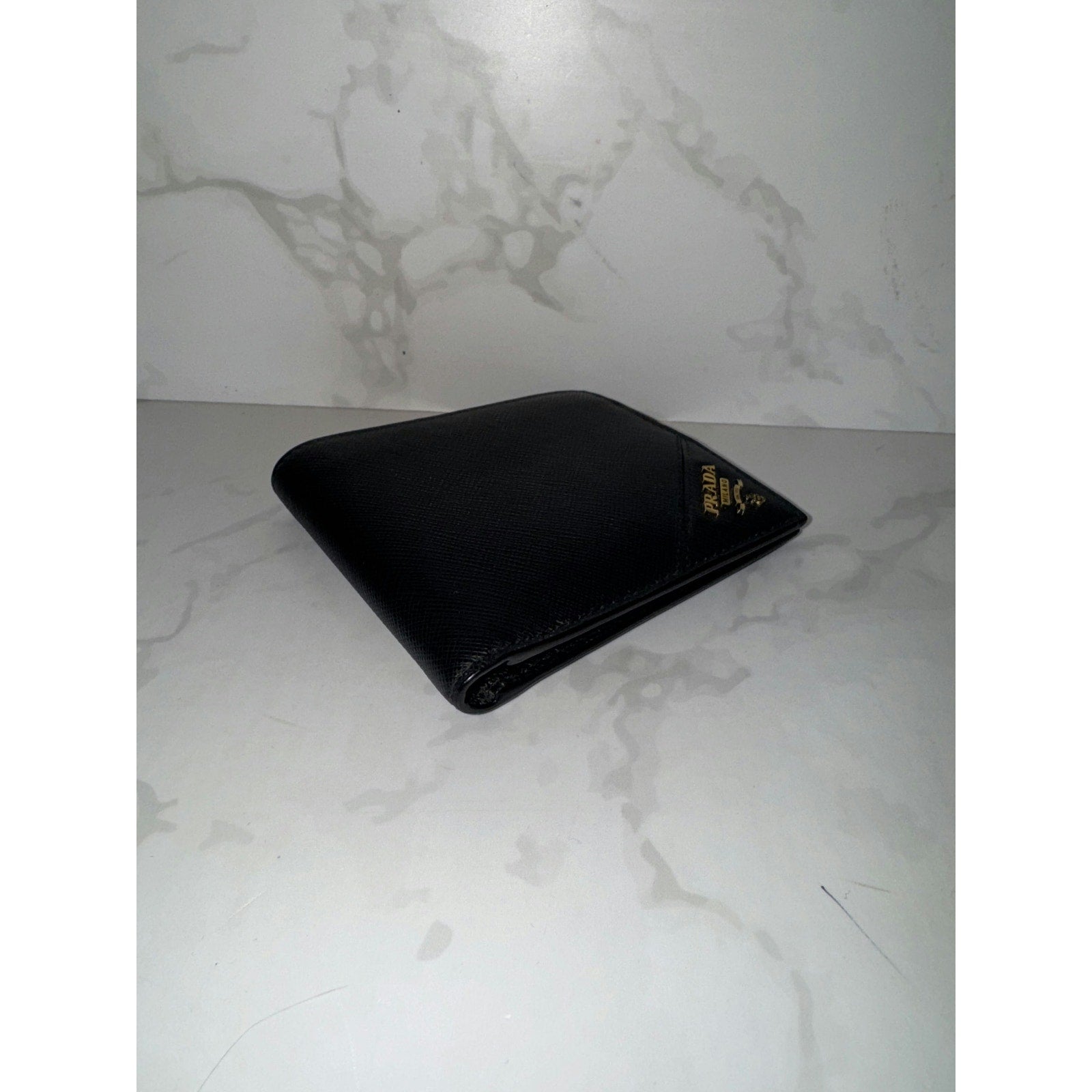 This elegant Prada wallet features classic Saffiano leather with multiple card slots, offering both style and functionality.