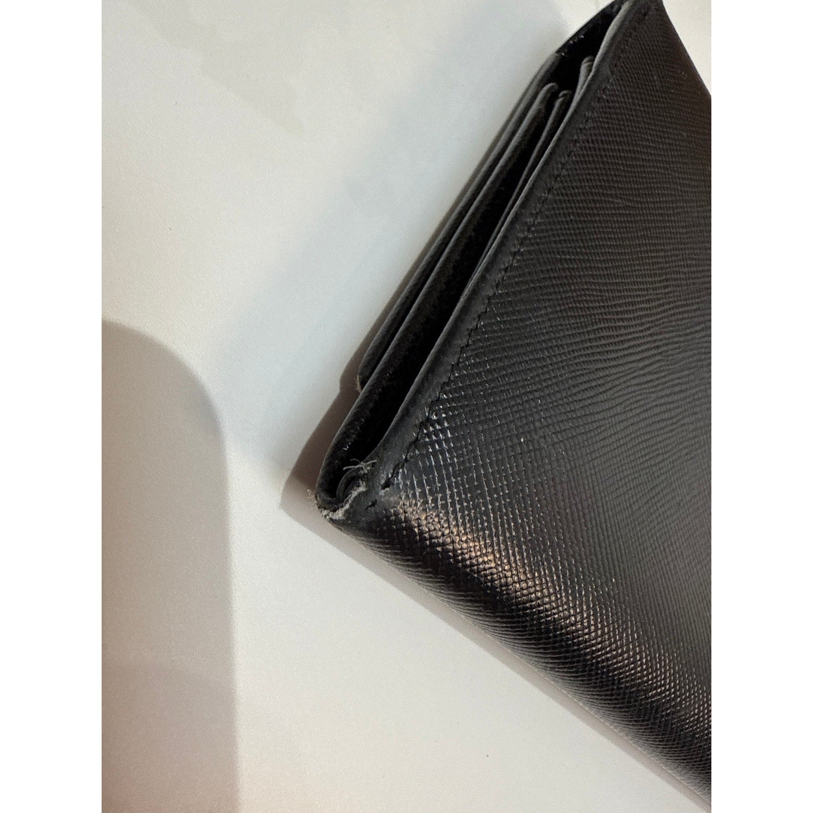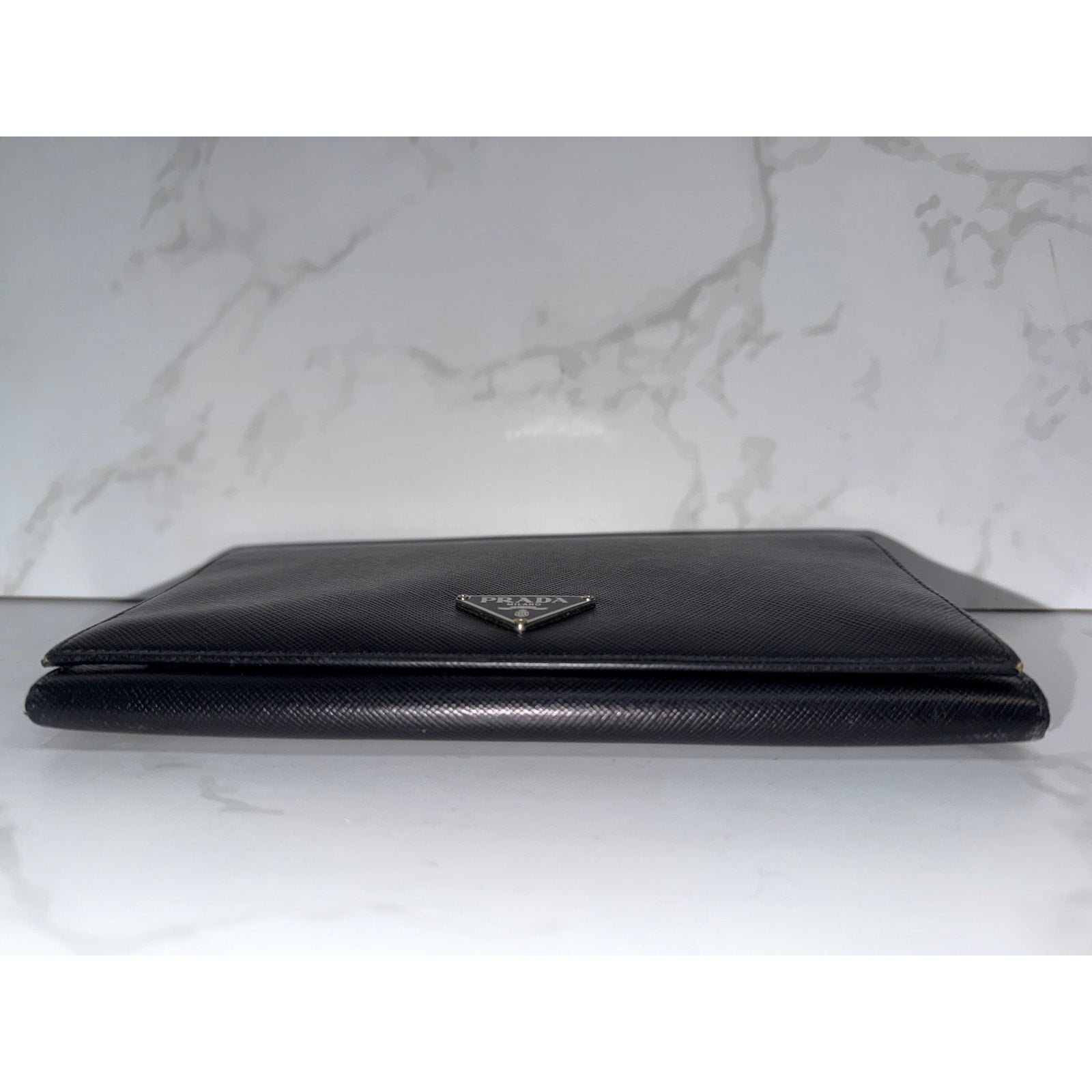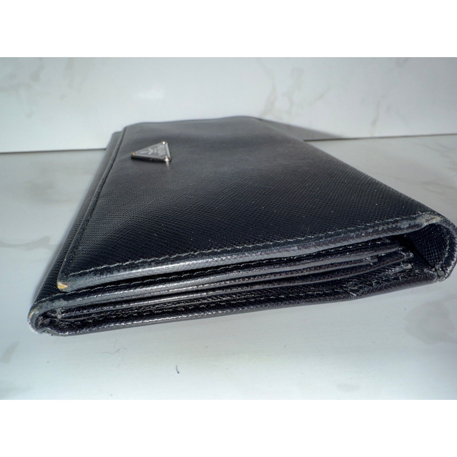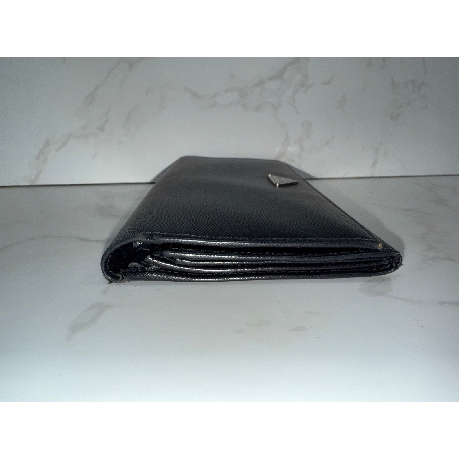 This classic Prada wallet showcases the brand's signature Saffiano leather in timeless black, featuring the iconic triangle logo plaque in silver-tone. The continental design offers ample space with multiple card slots, bill compartments, and a zippered coin pocket. The durable Saffiano leather ensures long-lasting wear while maintaining its sophisticated appearance.